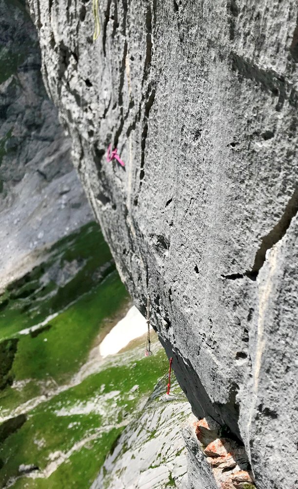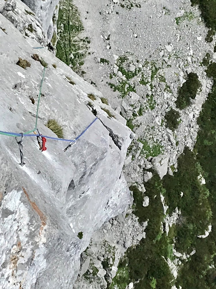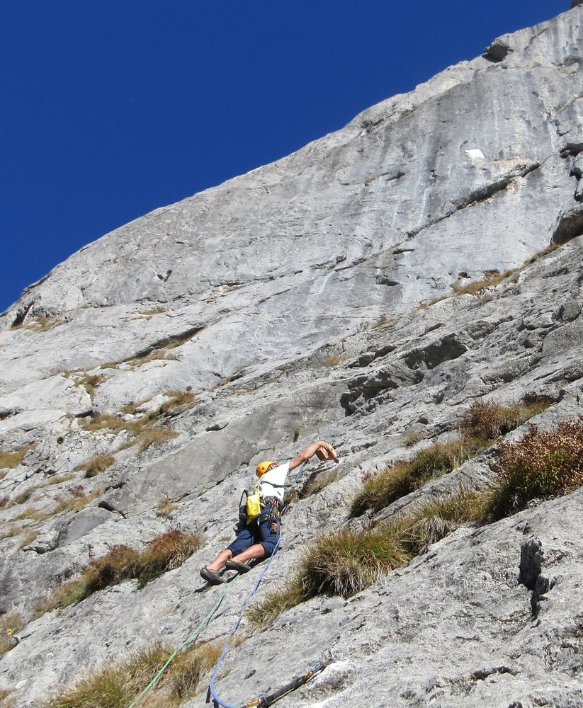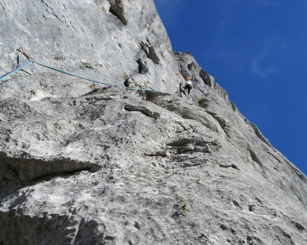 5 SL. Ca. 35 m zuerst über schöne Platten zu extrem steilen und teils leicht überhängenden sehr schwierigen Schulterriss (oder piazen--sehr anstrengend) frei ca. IX-