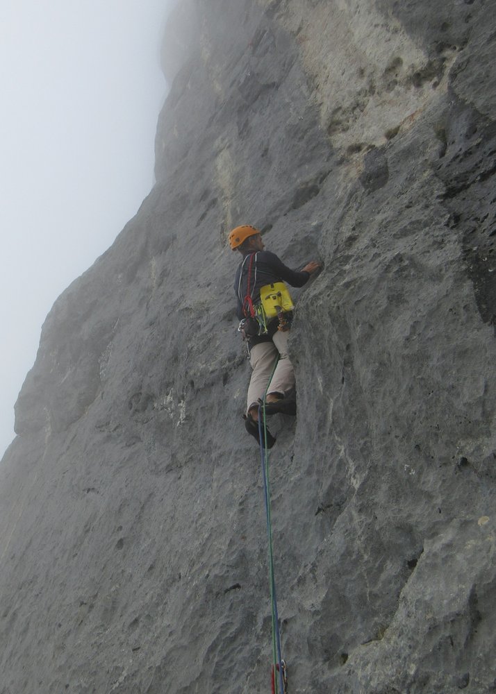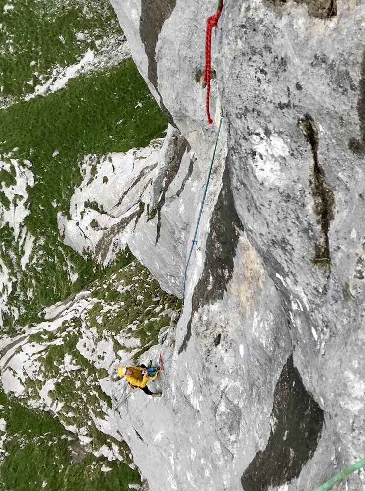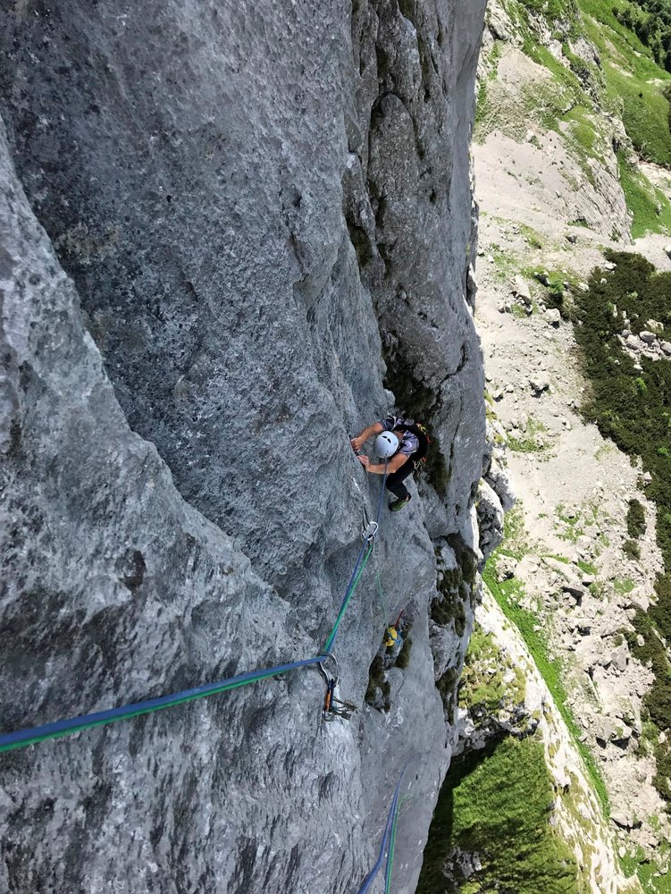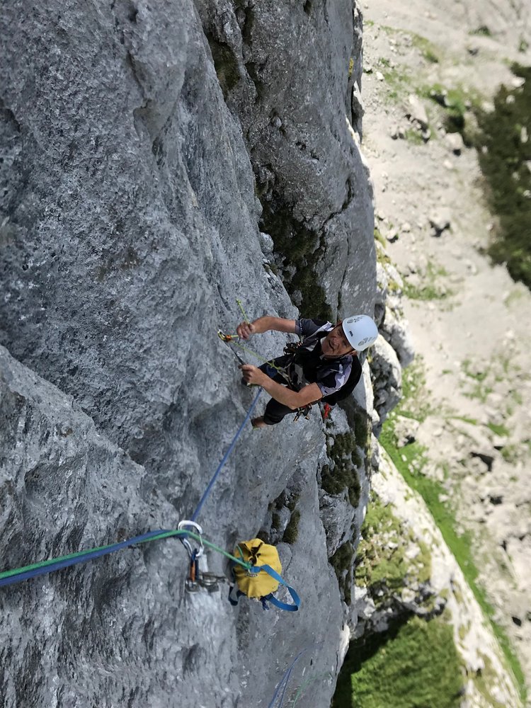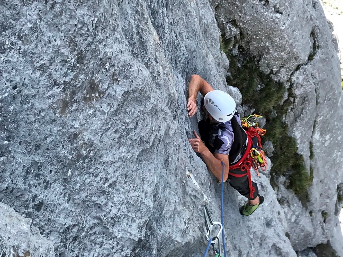 5 SL. Ca. 35 m zuerst über schöne Platten zu extrem steilen und teils leicht überhängenden sehr schwierigen Schulterriss (oder piazen--sehr anstrengend) frei ca. IX-