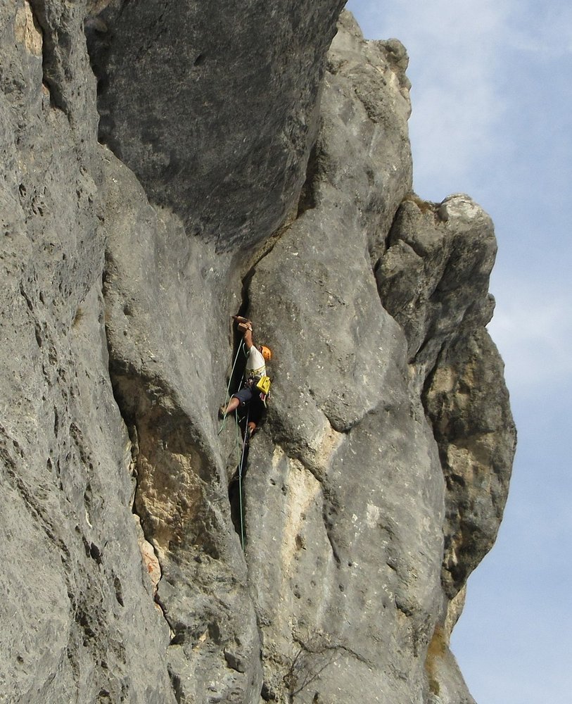 8 SL. 50 m zuerst den Überhang rechts umgehen (links in Verschneidung ist Verhauer mit einem BH!!)