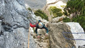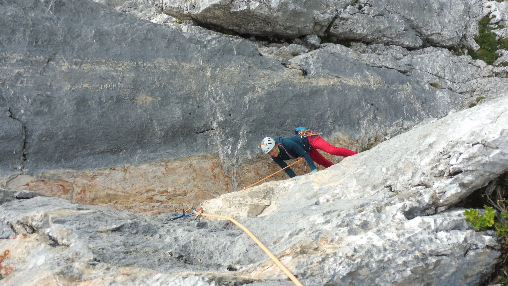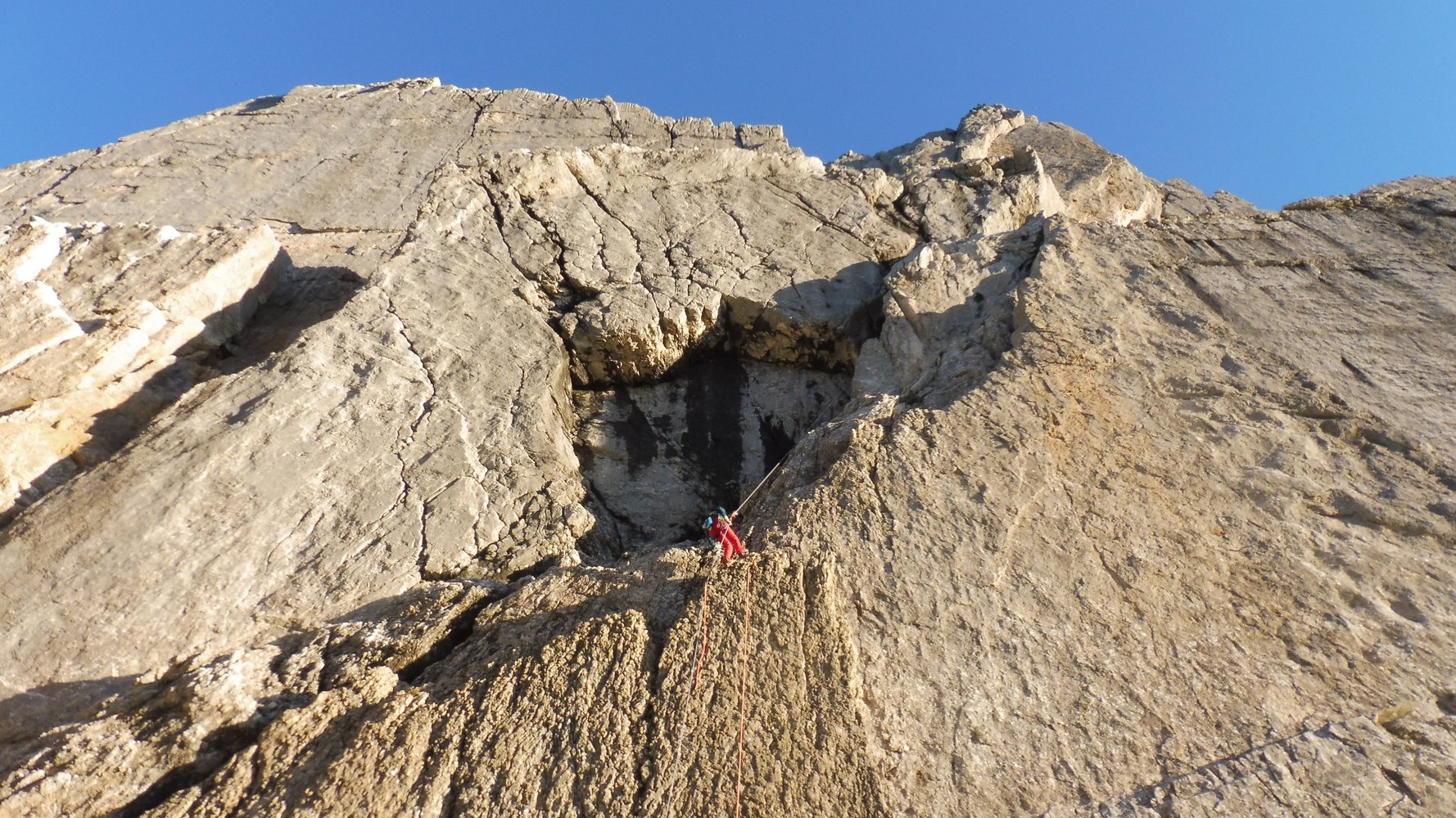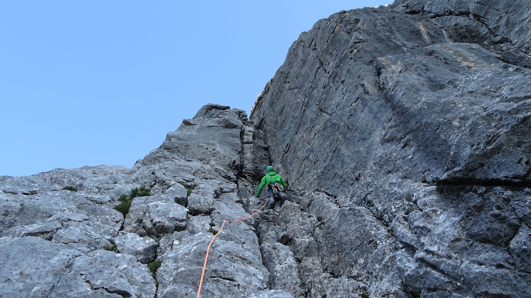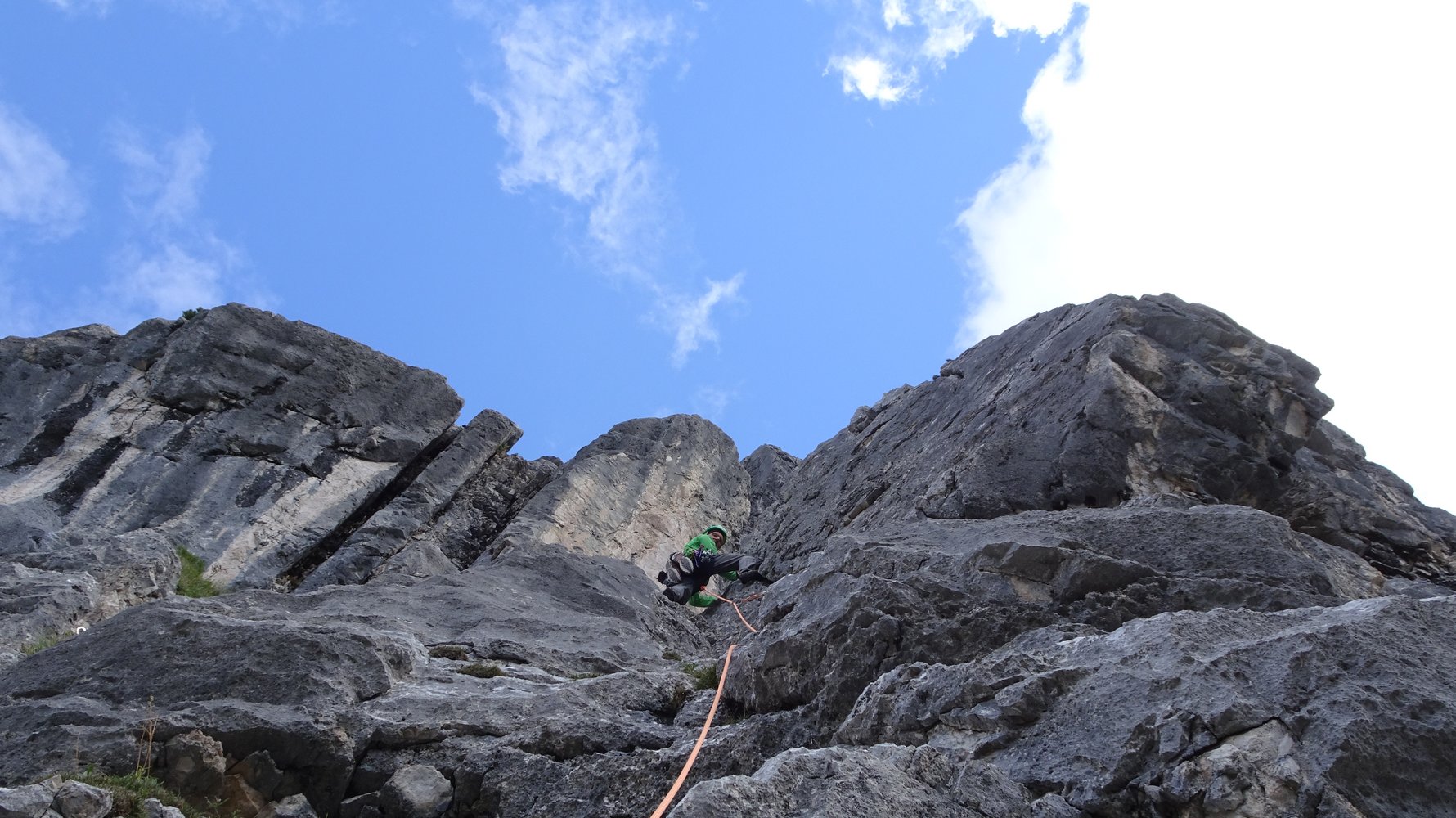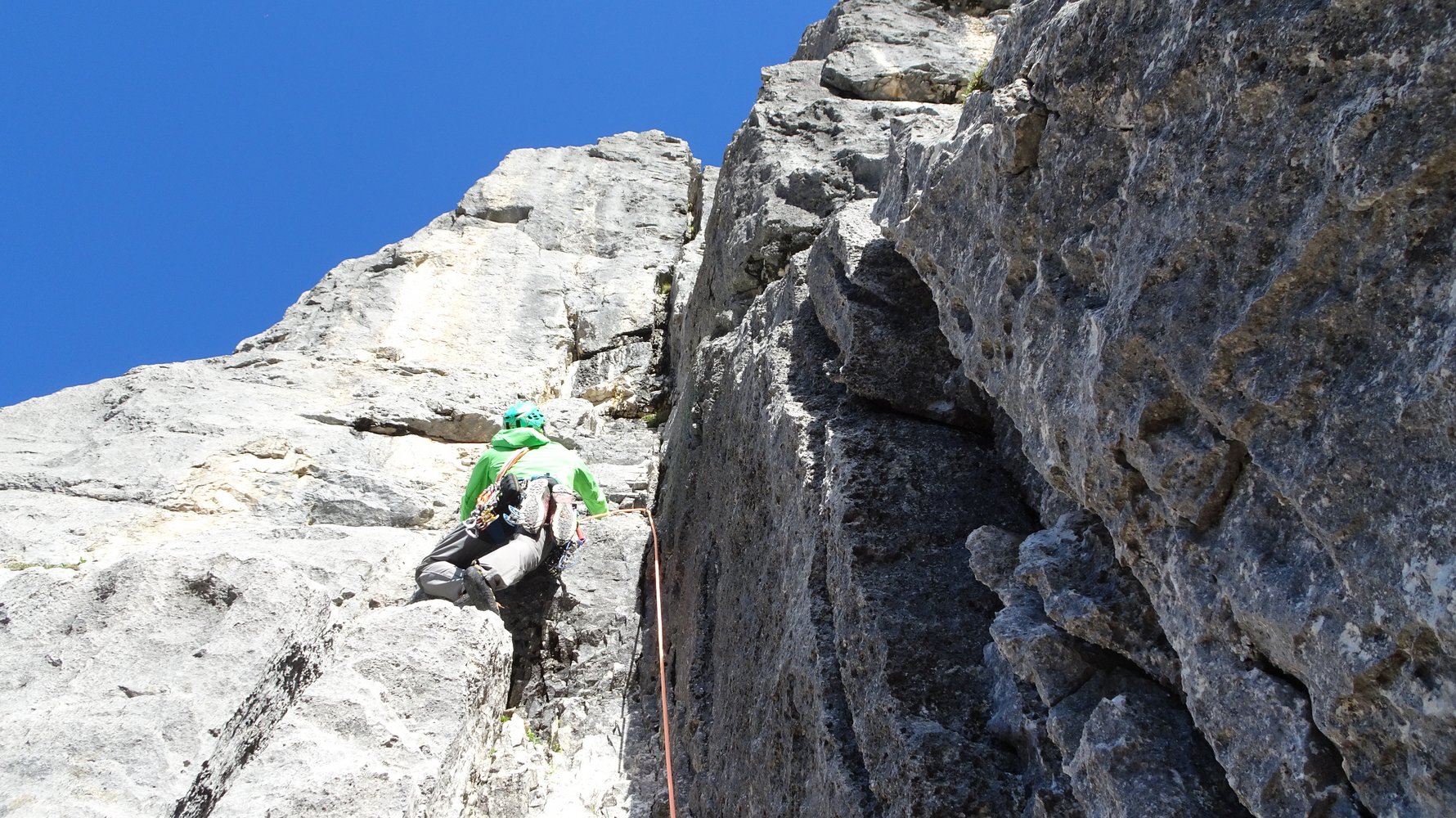 Die Route startet rechts des "Burattipfeilers" über leichtes Gelände, ehe gleich die Schlüssellänge (V+/VI-) folgt. Diese zieht am Ende über eine glatte Platte nach links zum Stand, wo auch die neue Tour "Falco" heraufkommt. Über griffigen Fels führt unsere Führe gerade empor, ehe auch beim nächsten Stand die beiden Routen wieder zusammen kommen. Die Tour wird sehr selten geklettert und es steckt nur wenig fixes Material (außer an den Ständen), also eine super alpine Alternative zu den sanierten Routen an der Westwand.