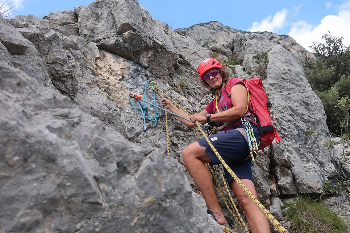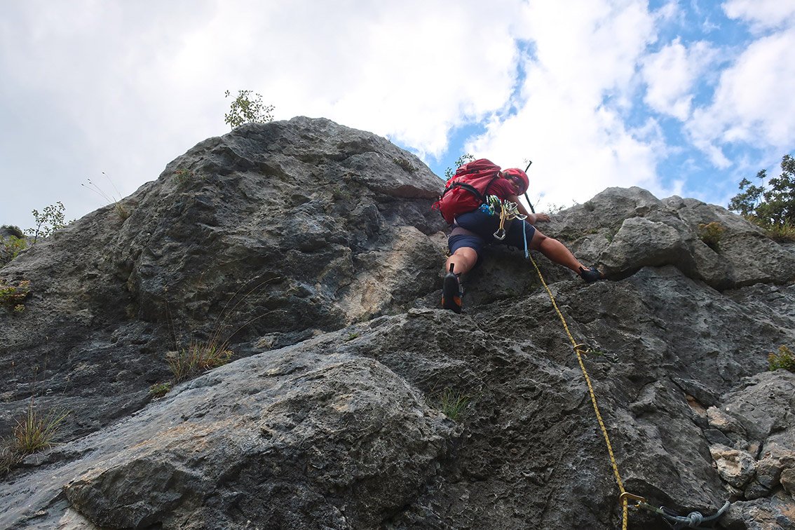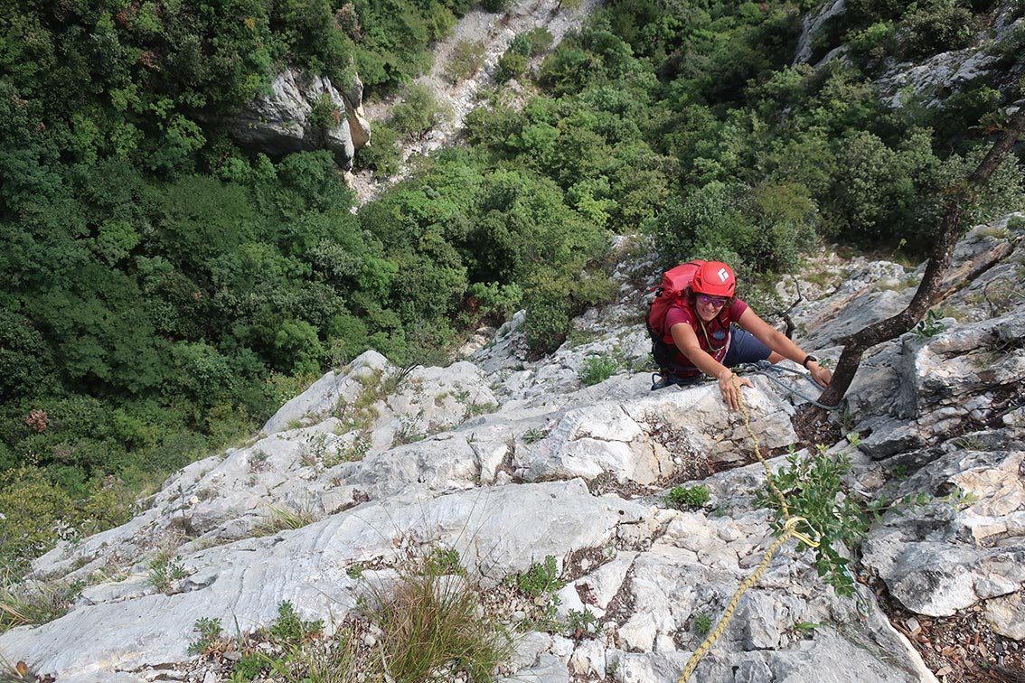 Wir sind sowohl entlang der Felsen (Klettergarten Camerette) als auch direkt auf der Schutthalde zugestiegen. Der beste Weg ist aber der vom Erstbegeher mit blauen Punkten markierte Aufstieg laut unserer Zustiegsberschreibung.