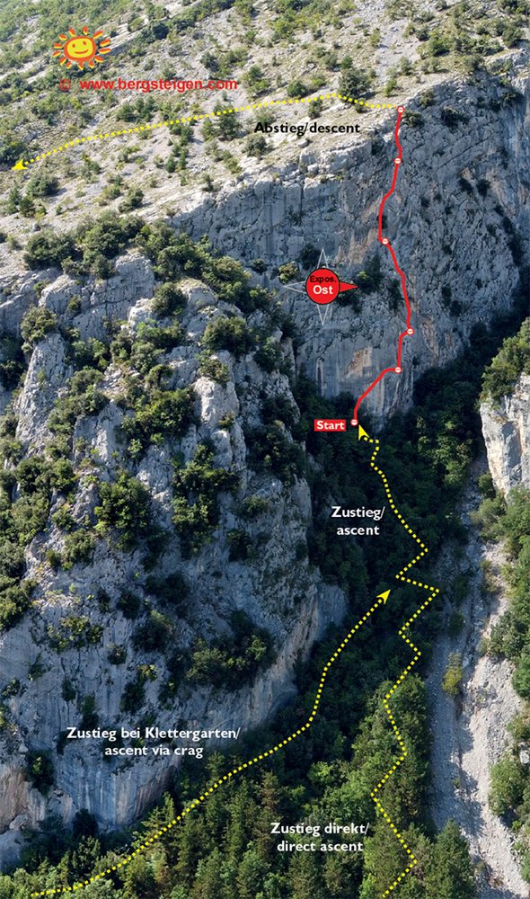 Vom Parkplatz bei der Kirche über die Sarca zur Bundesstraße, dort kurz rechts, dann aber gleich wieder links hinauf (markierten Wanderweg; Schilder Ferrata del Rampin). Man folgt der Straße, ab der Schranke ein Forstweg, etwas, nach ein paar Minuten zweigt rechts in flachem Gelände ein Forstweg ab (auch Radmarkierung). Auf diesem weiter, der Forstweg fällt kurz etwas ab, in diesem Bereich zweigt links, aufwärts ein deutlicher Pfad ab, diesem folgt man bis zu einem Schuttfeld (dort sieht man hinauf zur Felswand, an der sich die Route befindet). Etwas weiter dem Pfad folgen, bis links ein Pfad (blaue Punkte) nach dem Schuttfeld aufwärts führt, auf diesem Pfad im Bereich der Schutthalden den blauen Punkten bis zum Einstieg (blauer Pfeil bei Rampe) folgen.