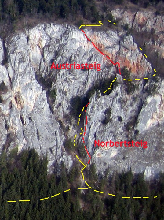 Der Norbertsteig bietet eine sehr alpine Rampen, Kamin und Risskletterei. Stände gebohrt, sonst einige alte Haken und 3 BH (tw. defekt). Der Fels ist nicht immer fest und sollte daher nur von echten Alpinisten berührt werden. Eine Sanierung würde ihn aber zum Klassiker werden lassen.