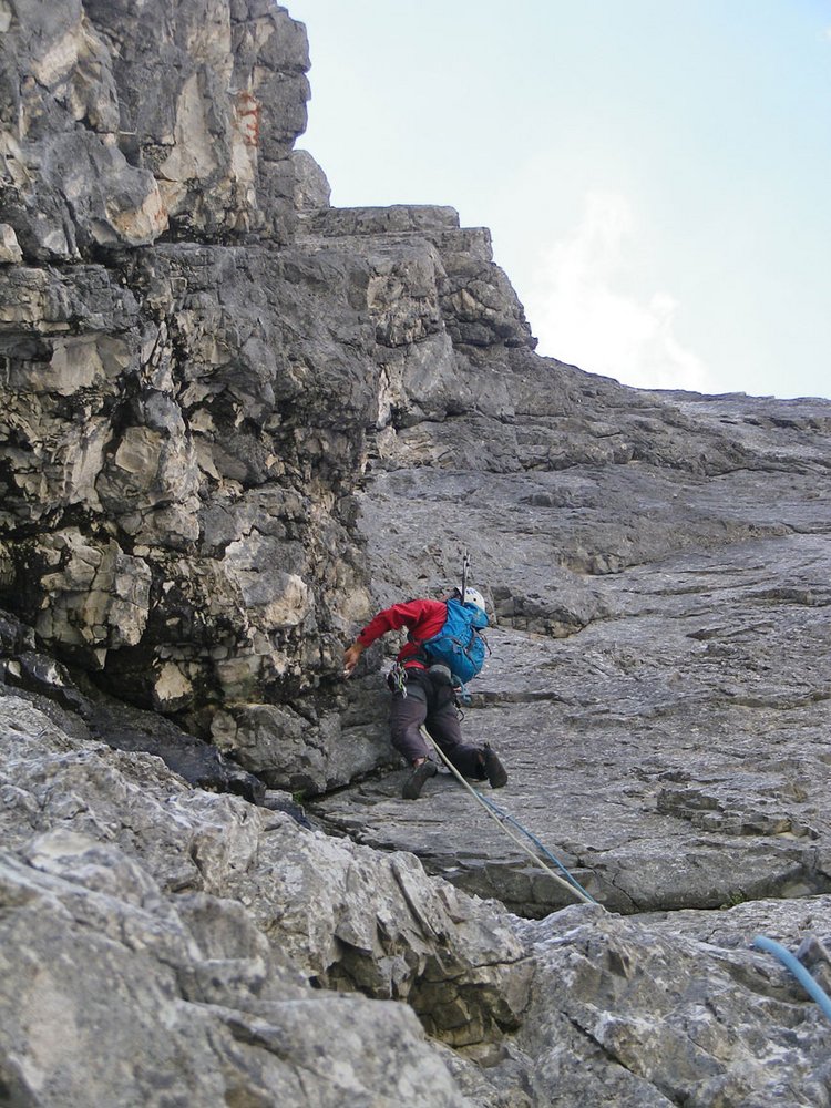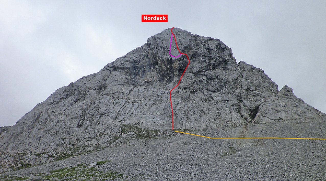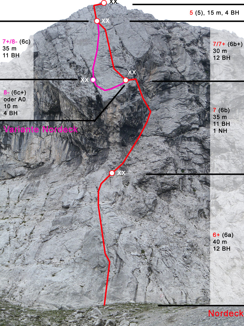 Siehe Topo. Nach der zweiten Seillänge gibt es links eine schwere Variante.
