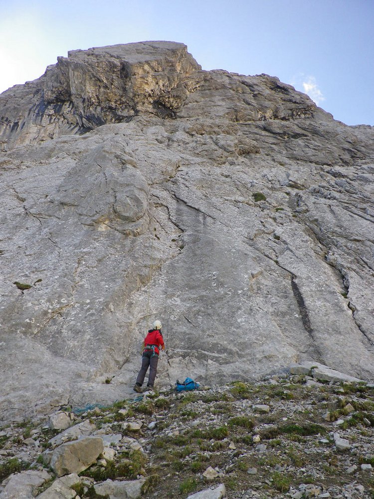 Von der Bergstation Hafelekar steigt man auf dem markierten Weg ins Tunigskar ab. Unten im Kar dann nach rechts zum Wandfuß. Der Einstieg ist bei einer markanten Verschneidung in der Wandmitte.