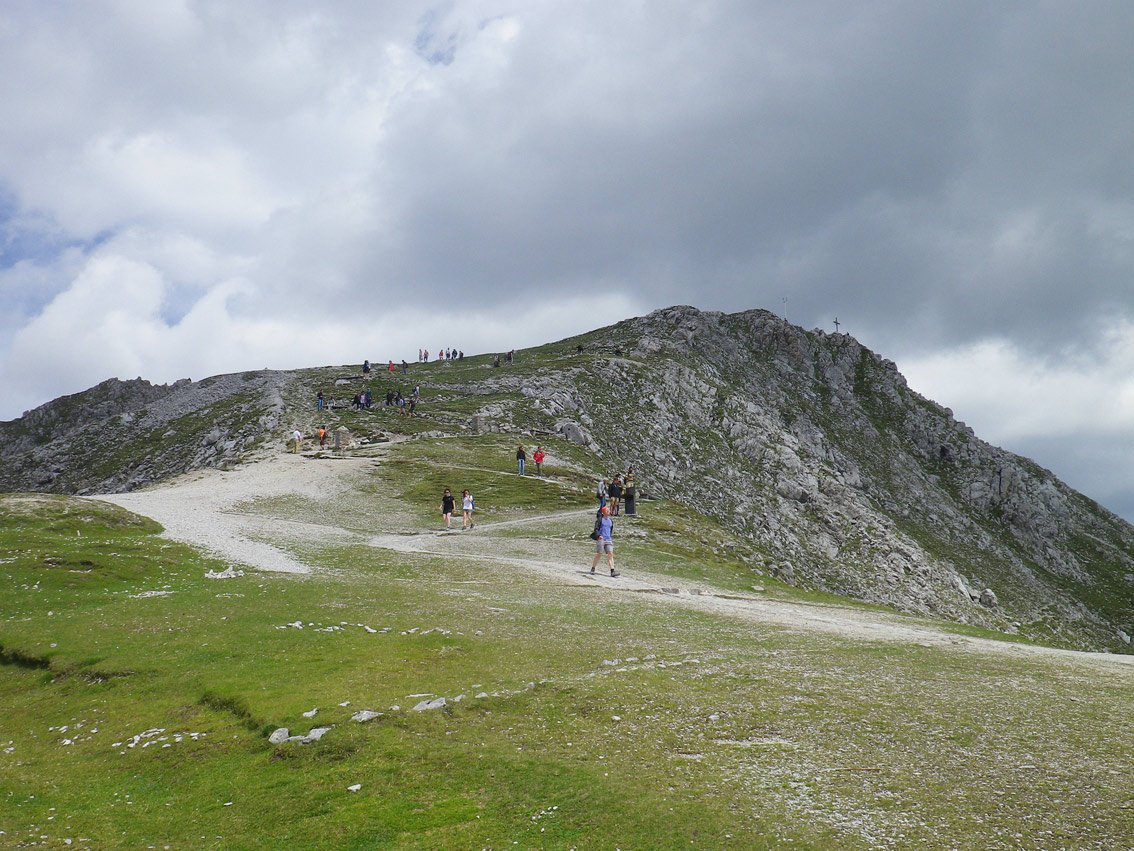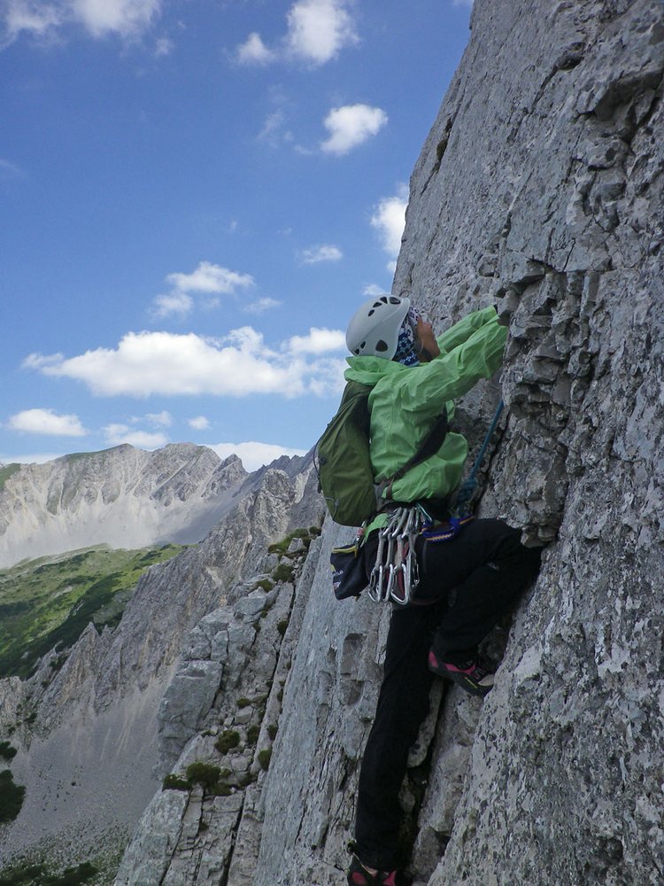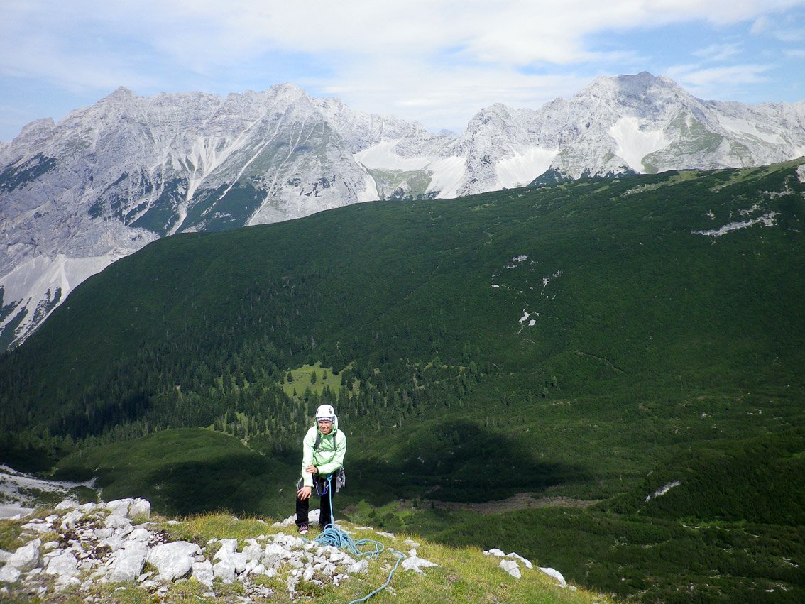 Vom Ende der Kletterei auf dem Nordrücken (leichte Schrofen und Grat) der Hafelekarspitze hinauf. Von dort in wenigen Minuten zur Seilbahn (die letzte Talfahrt ist um 17 Uhr - Stand Sommer 2017).