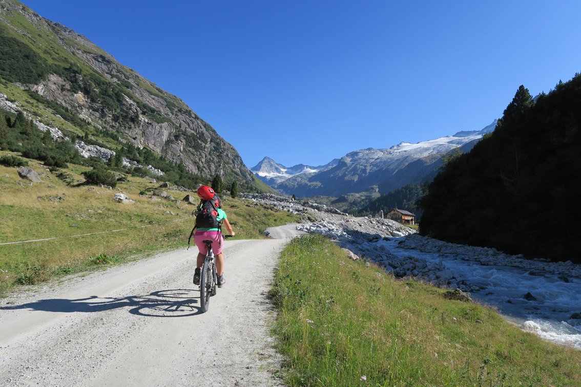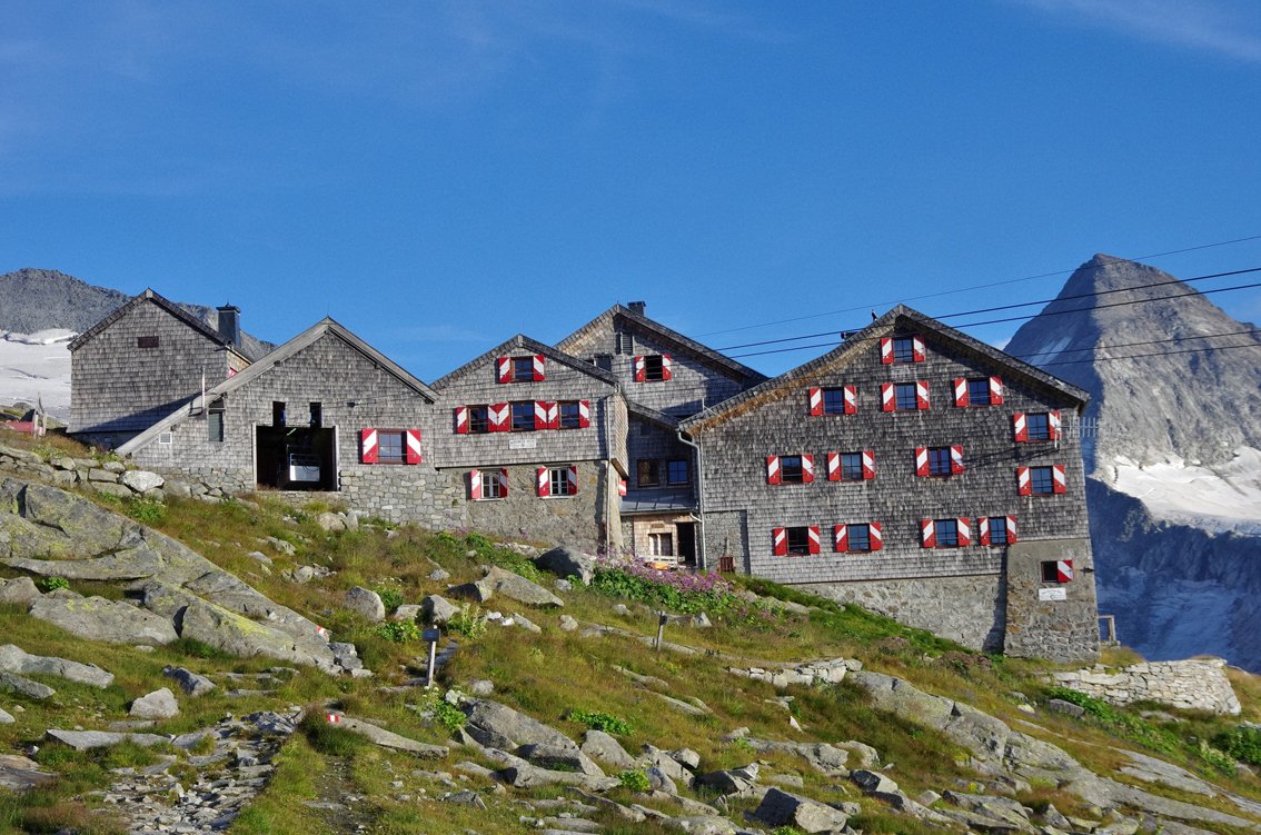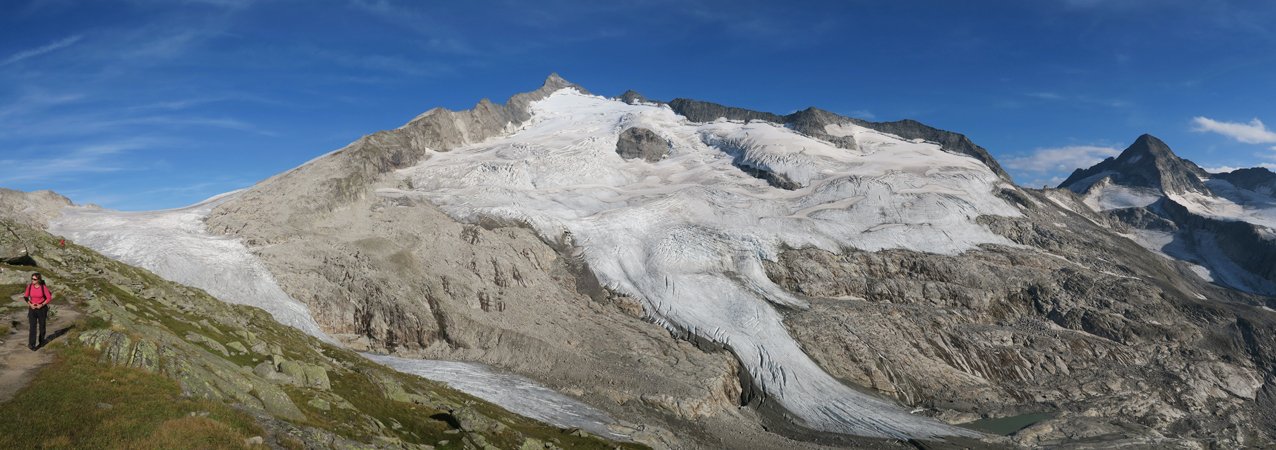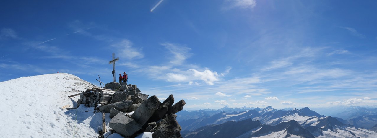 Vom Gipfel östlich auf dem oberen Keesboden des Schlatenkeeses zur Venedigerscharte (3407 m) absteigen. Dort dann in Richtung Norden (kurz steiler, sehr große Spalten!) hinunter auf das Obersulzbachkees und im Bogen wieder zurück zur Kürsingerhütte.
