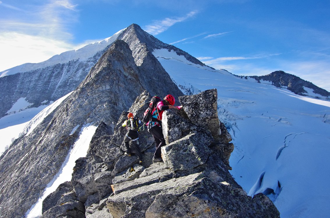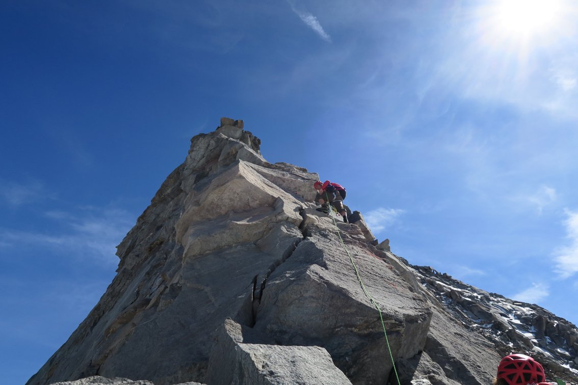 In der Schlüsselseillänge gibt es zwei Standplätze und einige Bohrhaken, der Rest des Grates ist je nach Bedarf selbständig abzusichern.