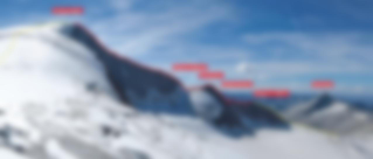 Siehe auch Topo: Von der Stange auf ca. 3295 m folgt man dem schmaler werdenden Grat. Bei einem Turm muss man steil hinunter (3, fixer Keil an der Kante), unten wird das Gelände leichter (1). Man überklettert den nächsten Aufschwung (2- und 1-2) und gelangt in die kleine Keidel-Scharte. Von dort weiter im Bereich des Grates höher (1-2), oben auf dem Grat dann zum Torwächter (3465 m). Vom "Gipfel" einfach hinunter zur Meynow-Scharte. Links vom Grat länger steil hinauf (2-3), bis der Grat wieder flacher wird (1-2). Auf dem Grat weiter (1-2 und leichter) bis sich dieser wieder stark aufstellt. Die Schlüsselpassage beginnt mit einem breiten Riss, danach leicht rechtshaltend zu einem roten Normalhaken. Von diesem links hinauf zu Haken. Die kleinen Stufen rechts werden links umgangen, danach folgt wieder leichteres Gelände. Am Ende dem leichten Blockgrat bis zum Gipfel folgen.