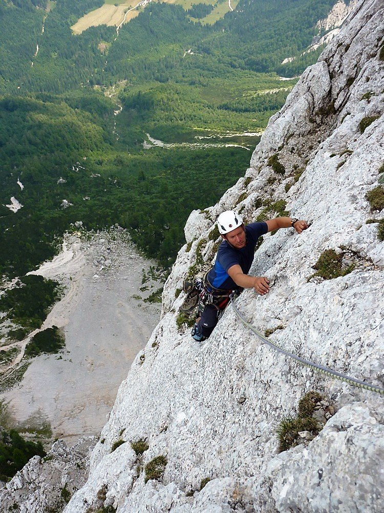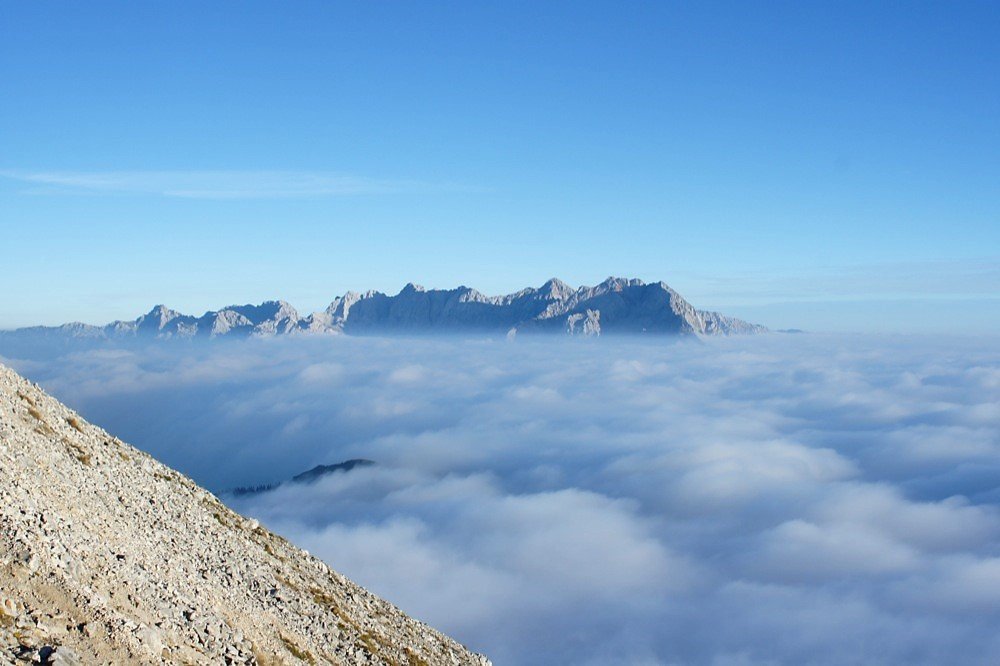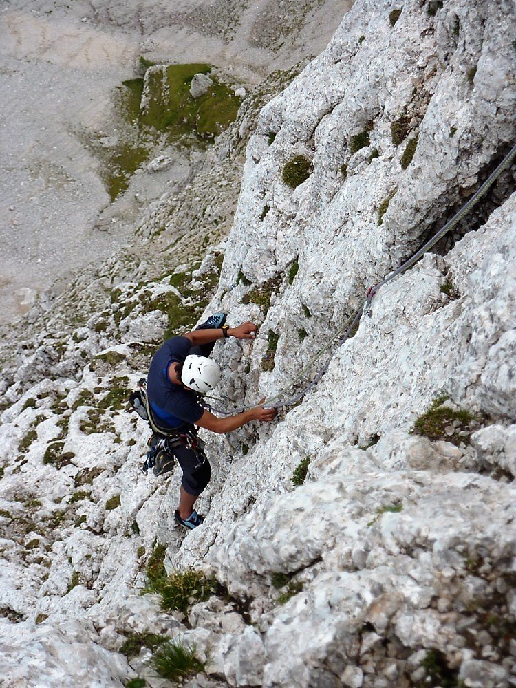 Vom Gipfel auf markiertem Steig 10-15min nach Westen absteigen bis zu einer Scharte. Einige Meter aufwärts zum Beginn des ÖTK-Klettersteigs bei einer blauen Tonne. Über den Klettersteig (B bzw. B/C) hinab und über das Schotterfeld zurück zum Einstieg. Weiterer Abstieg wie Aufstieg.