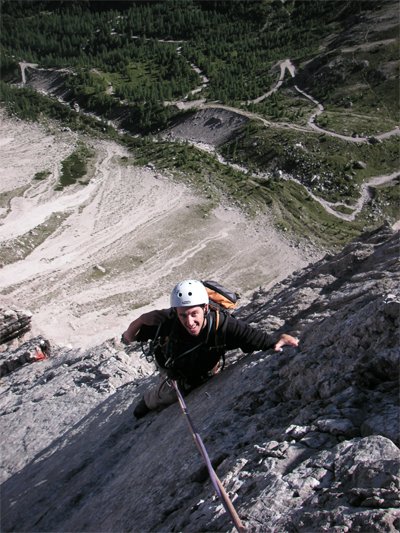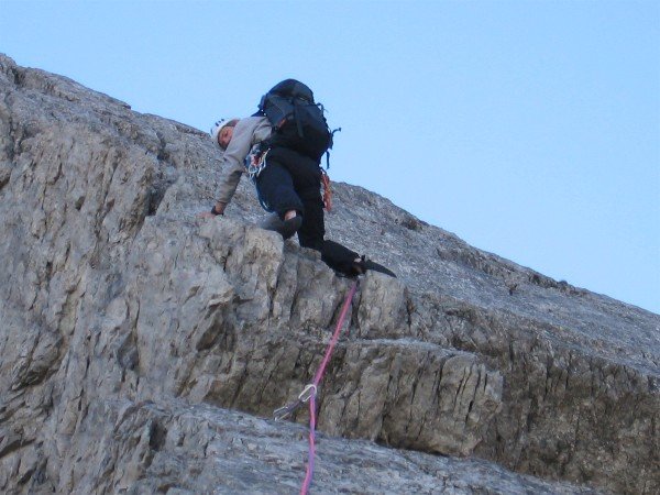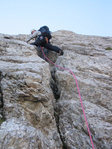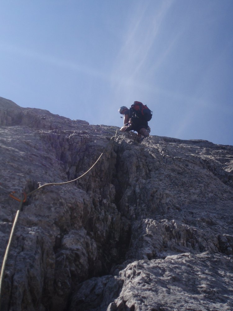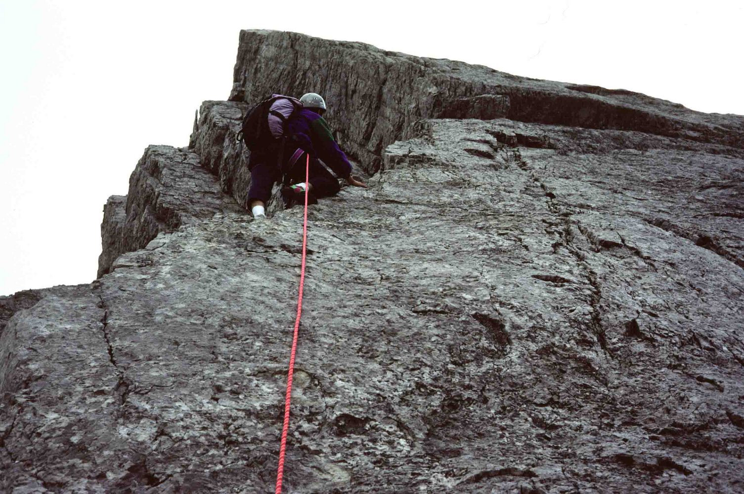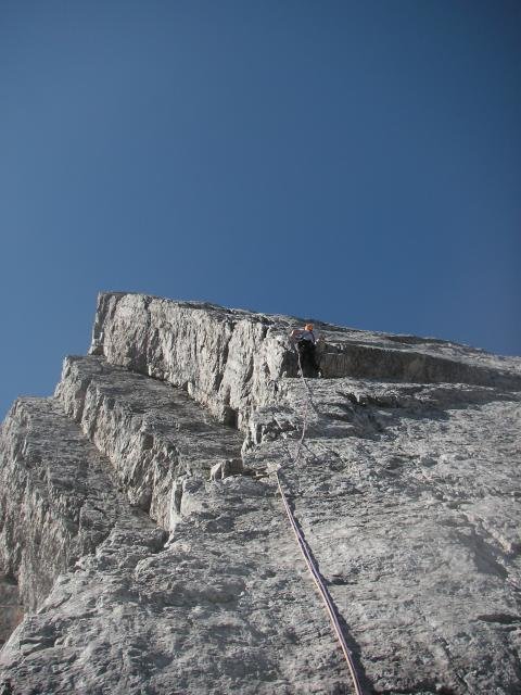 Siehe Topo. Die Schlüsselstelle (4) ist fast ganz oben an der luftigen Kante in der vorletzten Seillänge, meist ist die Kletterei um 3/3+ und leichter.