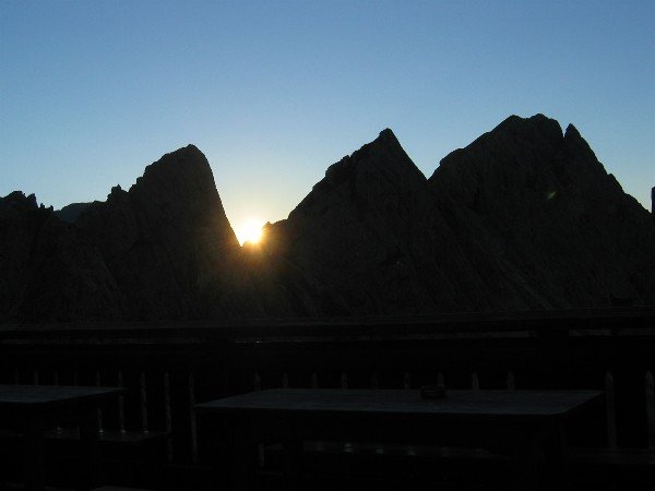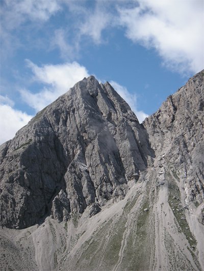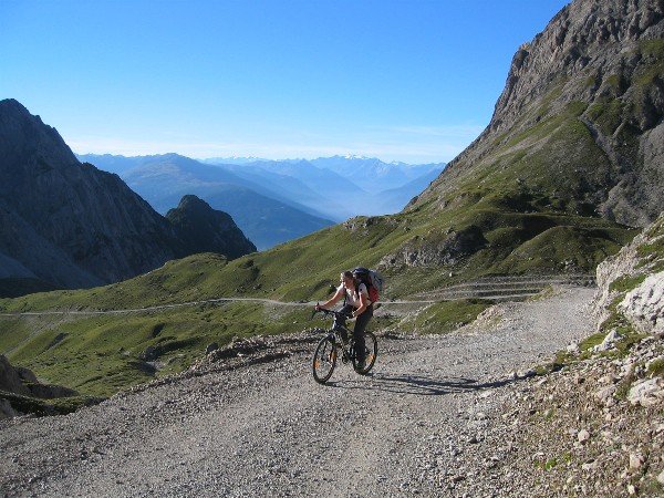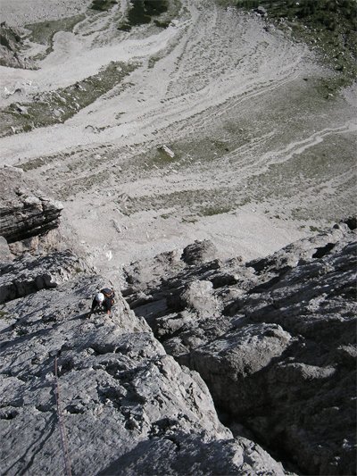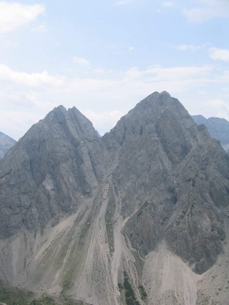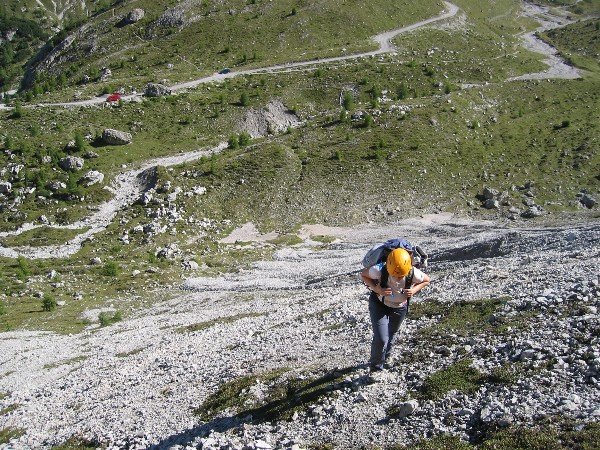 Vom Gipfel auf der Südseite dem Klettersteig hinunter zum Kerschbaumertörl folgen und von dort zum Zufahrtsweg der Karlsbader Hütte (MTB-Depot beim großen Felsblock) absteigen. Wer von der Hütte kommt quert unterhalb des Kerschbaumertörls rechts auf dem Weg zurück zur Lienzer Dolomiten-Hütte.