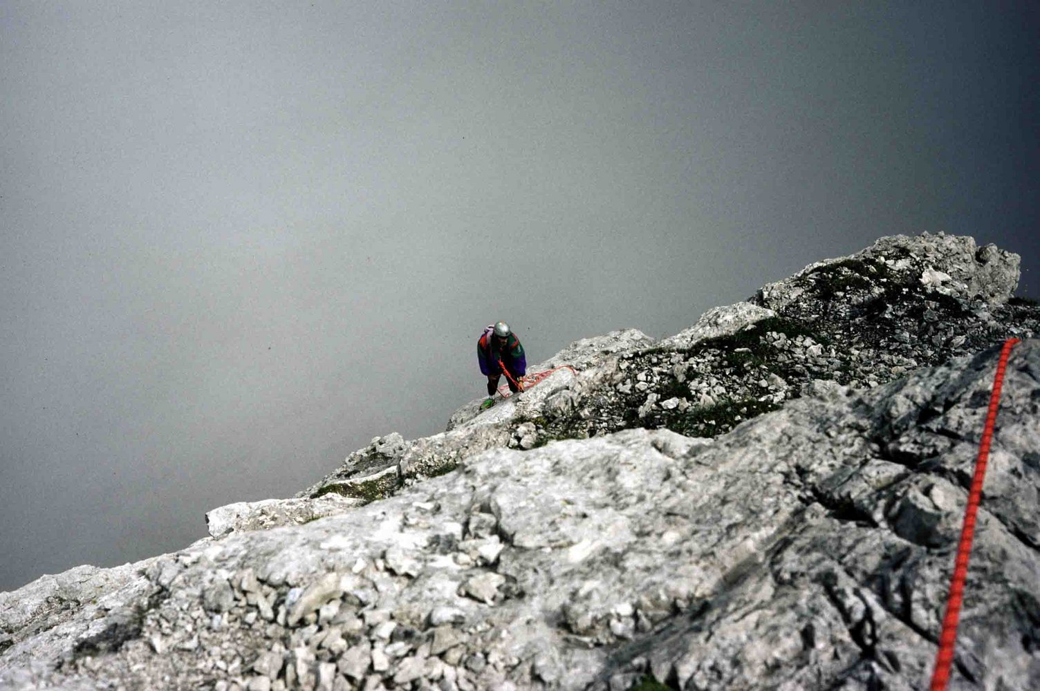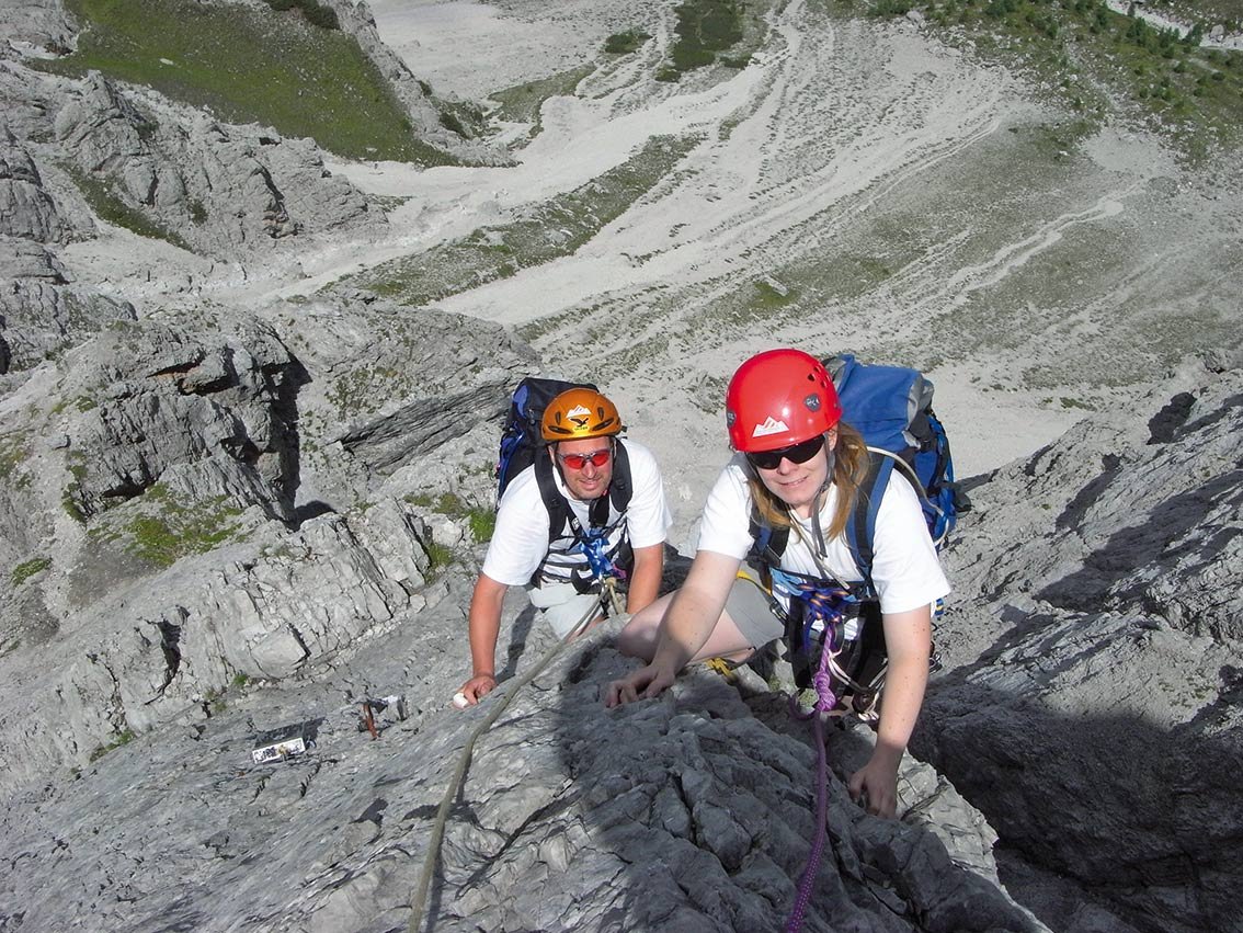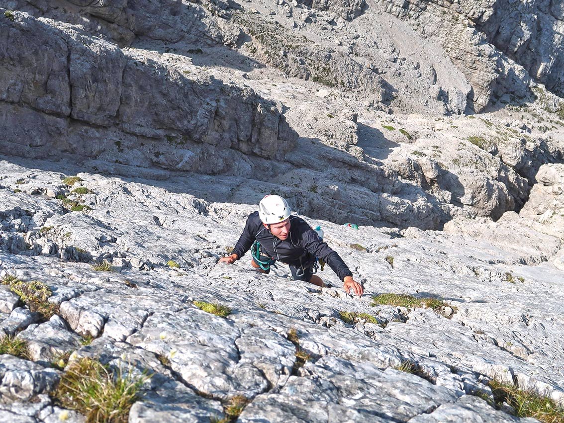 Der Anstieg auf der Nordostkante zur Kleinen Gamswiesenspitze ist ein sehr beliebter Genussklassiker, welcher auch gerne als Führungstour bei kurzen Abenteuerwochen gemacht wird. Die Kletterei führt über einen Mix von Platten, Rissen und kurzen Kaminen, wobei sich das Highlight ganz oben an der luftigen Kante befi ndet. Vom Gipfel hat man einen perfekten Ausblick in den Laserzkessel und im Norden sogar bis zum Großglockner. Der Anstieg gehört zu den kürzeren Alpinrouten in den Lienzer Dolomiten und der Abstieg wurde durch einen Klettersteig etwas erleichtert. Ein Manko kann der meist recht große Andrang sein, versierte Kletterer weichen dann auf die Gamsplatte (5-) rechts daneben aus (siehe Topo).
