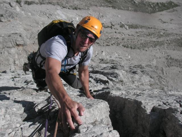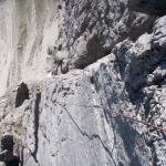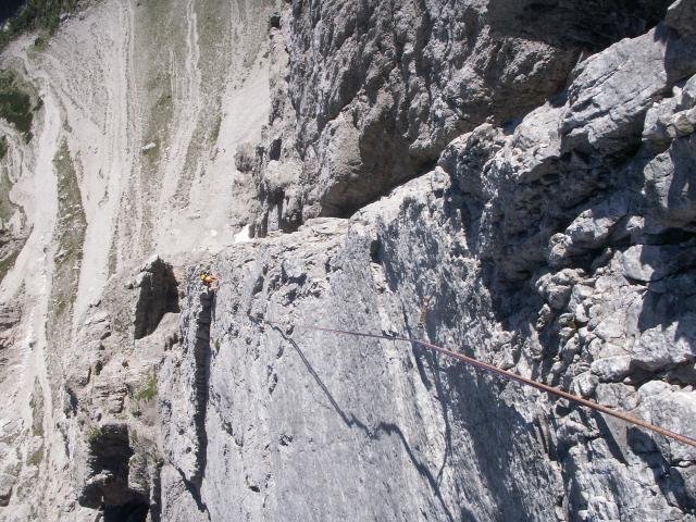 Absicherung besteht aus wenigen alten Bohrhaken und mehreren neuen Bühlerhaken. Letztere wurden durch die Bergrettung neu installiert.