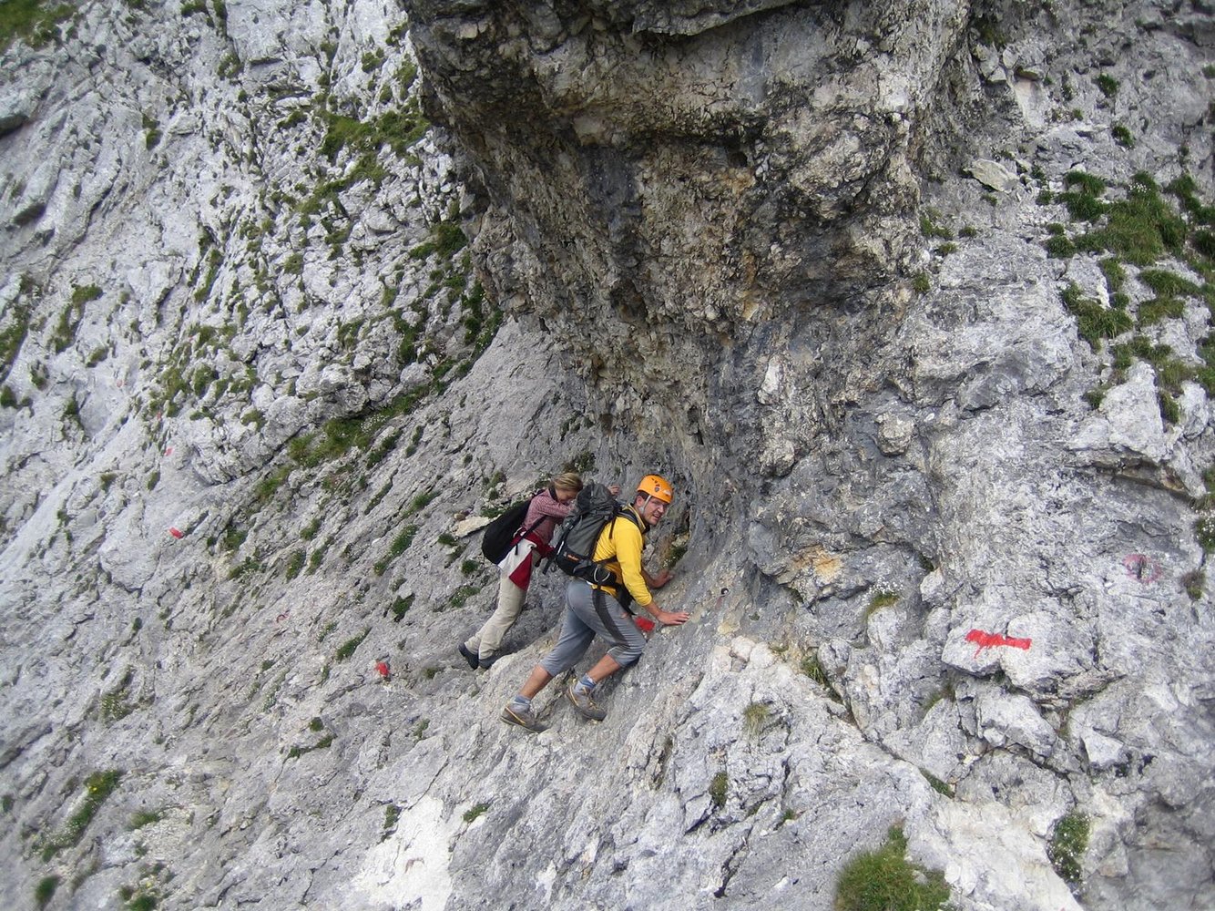 Die Tour ist an der Grenze zur Wanderung, führt aber über weite Strecken durch alpines Schroffengelände. Trittsicherheit und Schwindelfreiheit erforderlich. Helm für alle empfohlen. Seil und Gurt nur für Ungeübte. Bei Nässe sehr gefährlich und zu meiden.