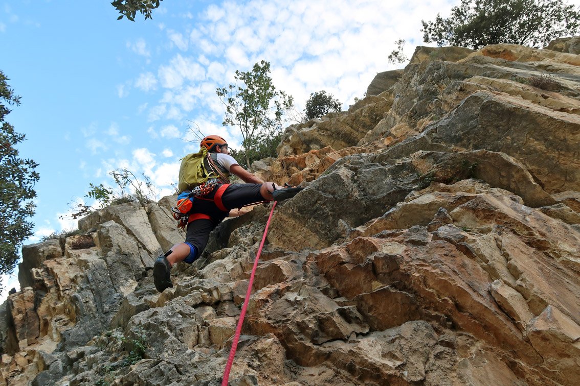 Die Tour ist mit vielen Sanduhren abgesichert, an den schwierigen Stellen stecken Bohrhaken.