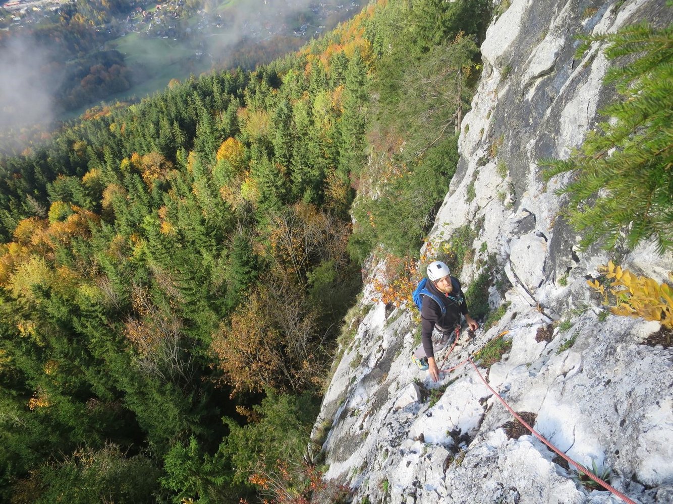 Sehr schöne und gut abgesicherte Route an der Ewigen Wand. Nach der zweiten Seillänge zweigt rechts die Variante "Zum ohoitn" (43 m, 7) und führ über einen großartigen Quarzpfeiler. Die Kletterei ist Ewige Wand typisch und erfolgt an Verschneidungen, Platten mit Quarzstreifen und Querrissen. Die Route bietet einen grandiosen Ausblick auf den Hallstätter See und den Dachstein.