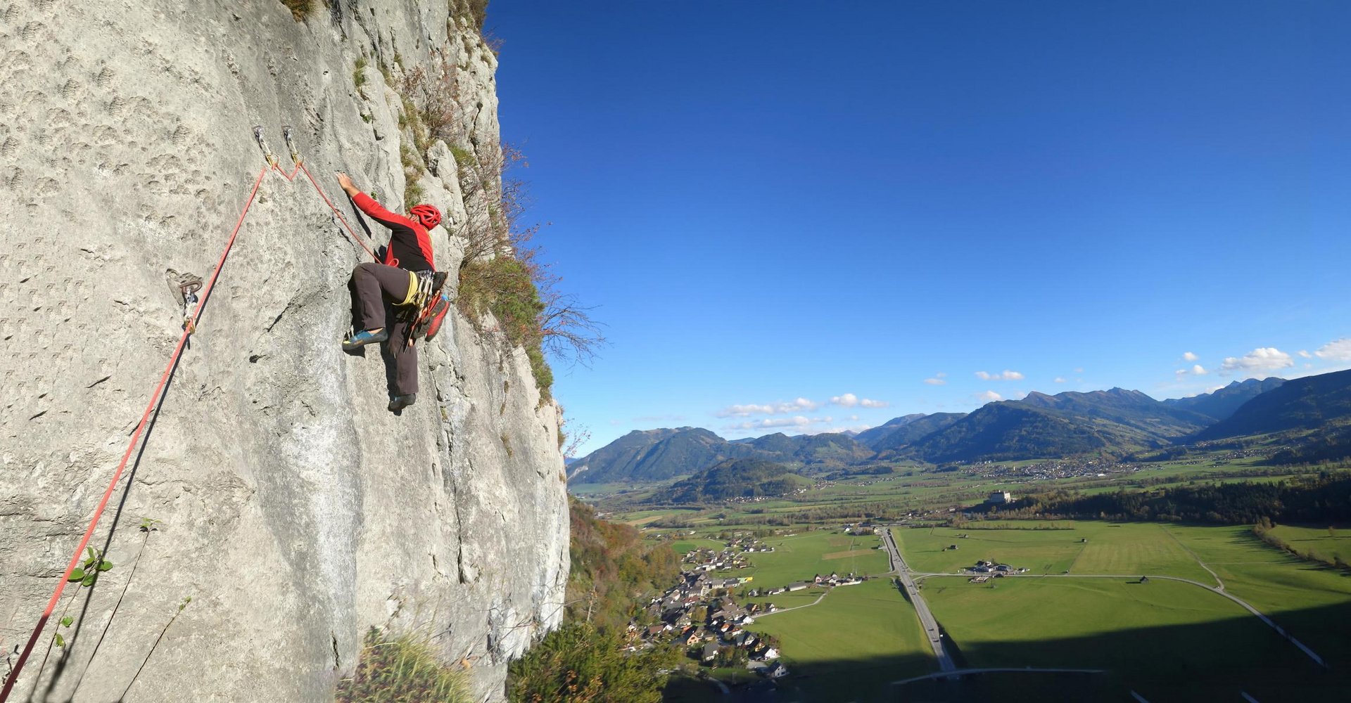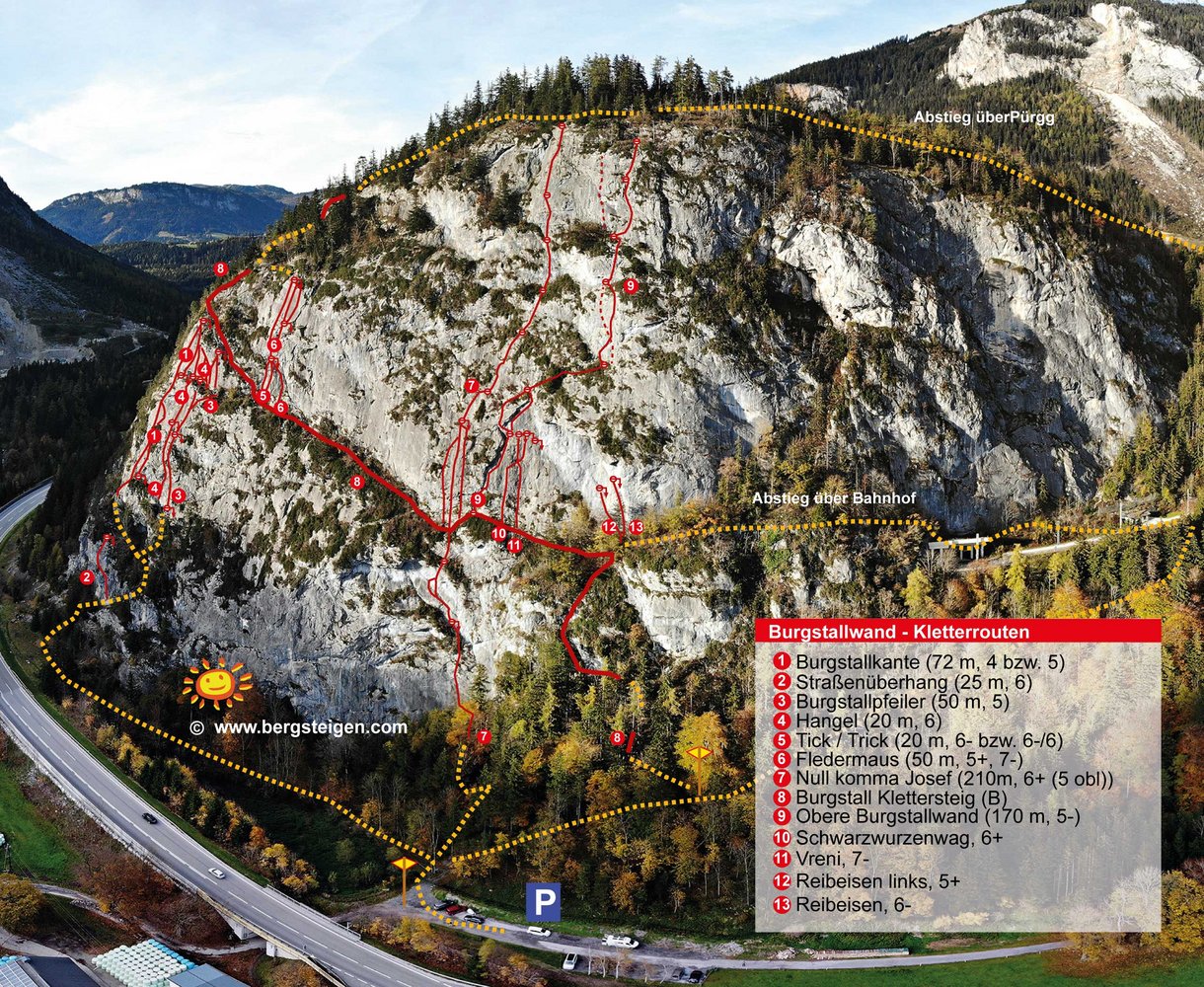 Durchaus ansprechende, einfache und klassische Route durch die obere Burgstallwand. Die Kletterei wird nach der 2. Seillänge durch eine Drahtseilquerung unterbrochen. Danach folgen noch vier kurze Seillängen.