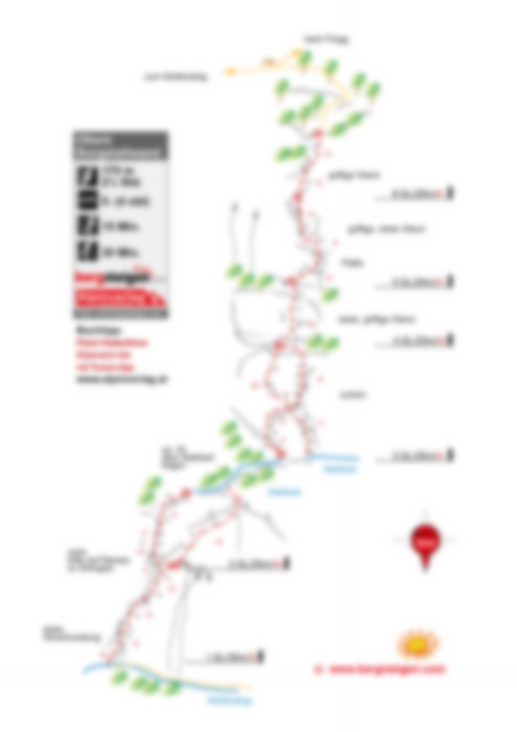 Vom Ausstieg nach garde und dann leicht rechtshalden aufs Plateau. Dort links zur Bank und auf dem Weg links zum Klettersteig und über den Klettersteig (B) zum Parkplatz absteigen, oder nach links nach Pürgg absteigen und vorbei an der sehenswerten Kirche nach Unterberg und zurück zum Parkplatz (+15 min).