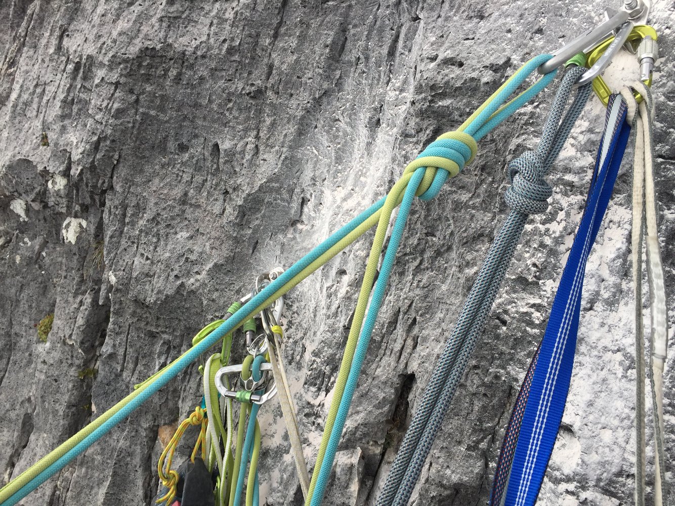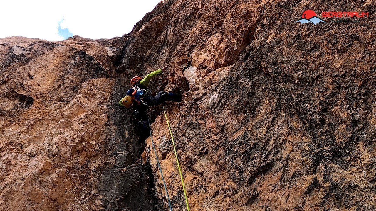 Die schwierigen Passagen sind gut mit Bohrhaken gesichert. Dazwischen ist immer wieder der routinierte Umgang mit Camelots notwendig. Insgesamt ist die Tour ausgesprochen gut, jedoch alpin gesichert. Für den Fall, dass es einmal nicht so klappen sollte, kann man von der Terrasse aus abseilen. Eine 650 m lange Abseilpiste ist eingerichtet.