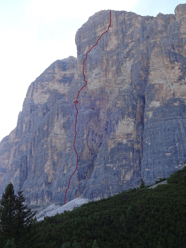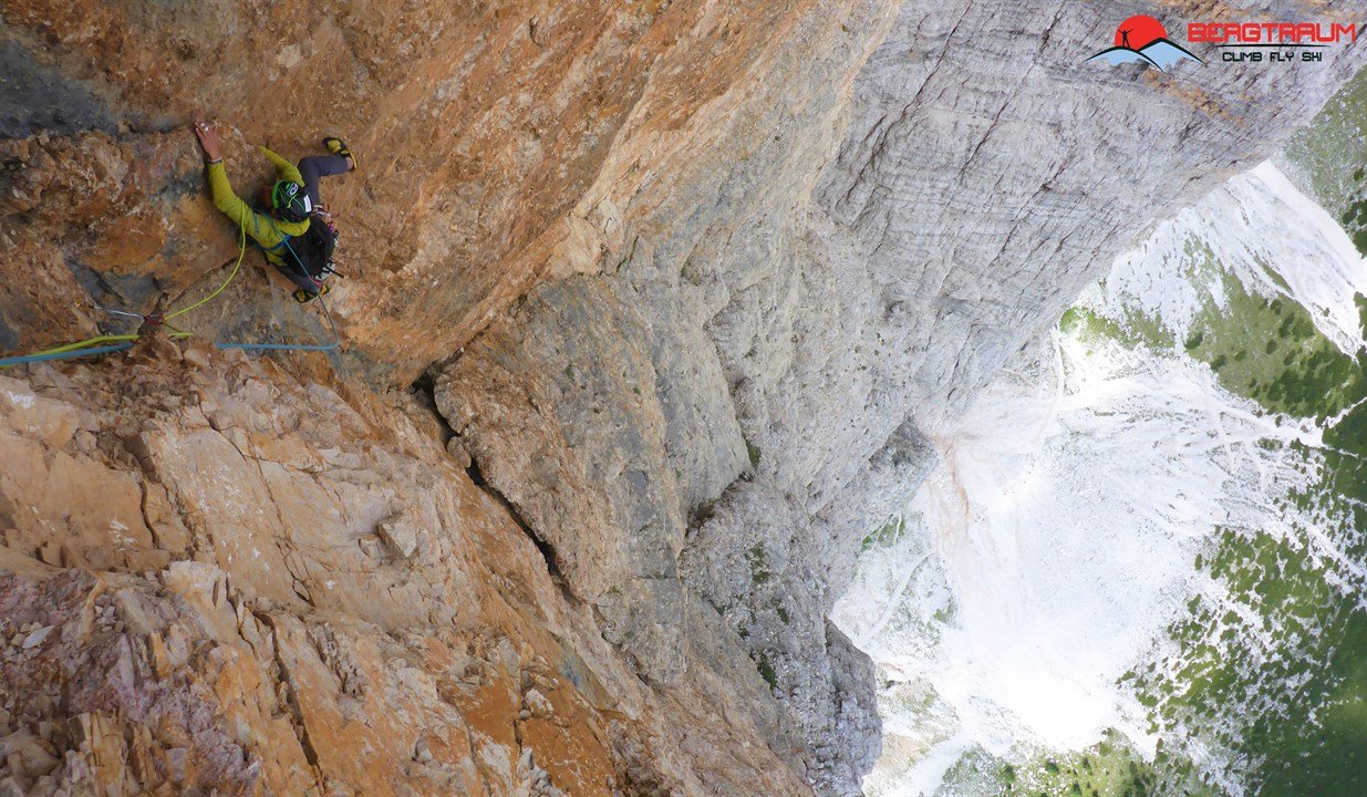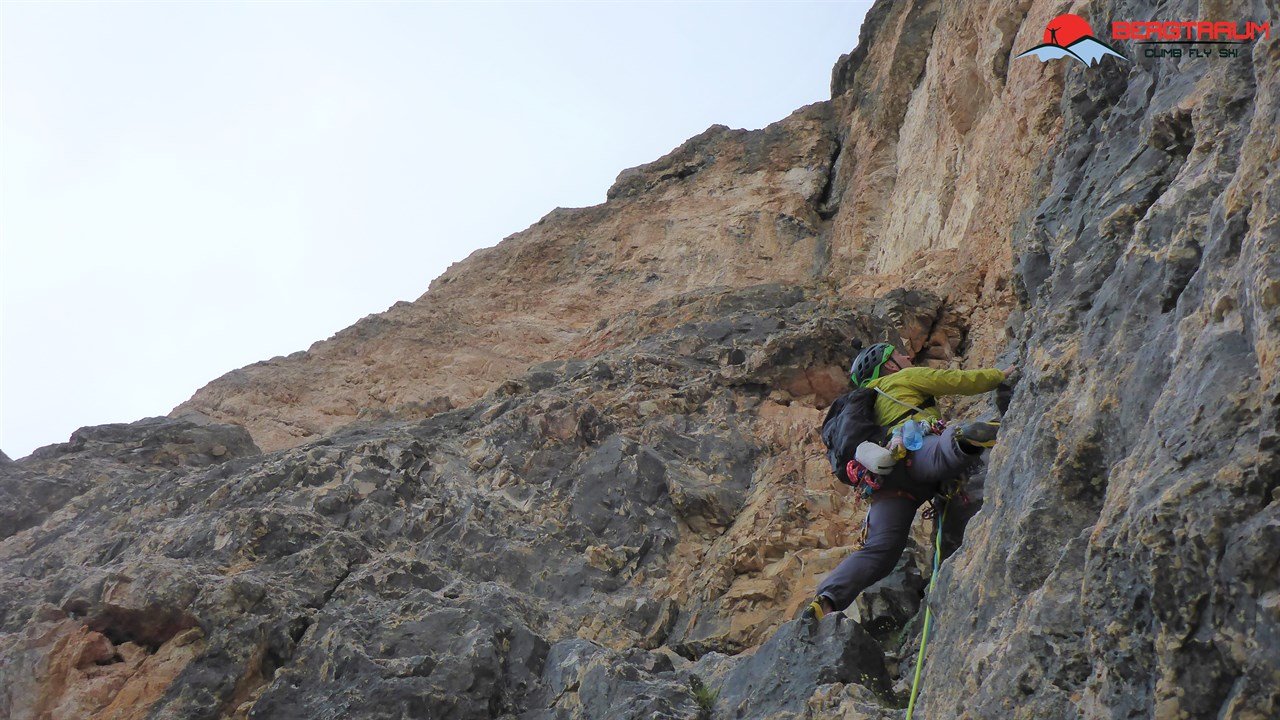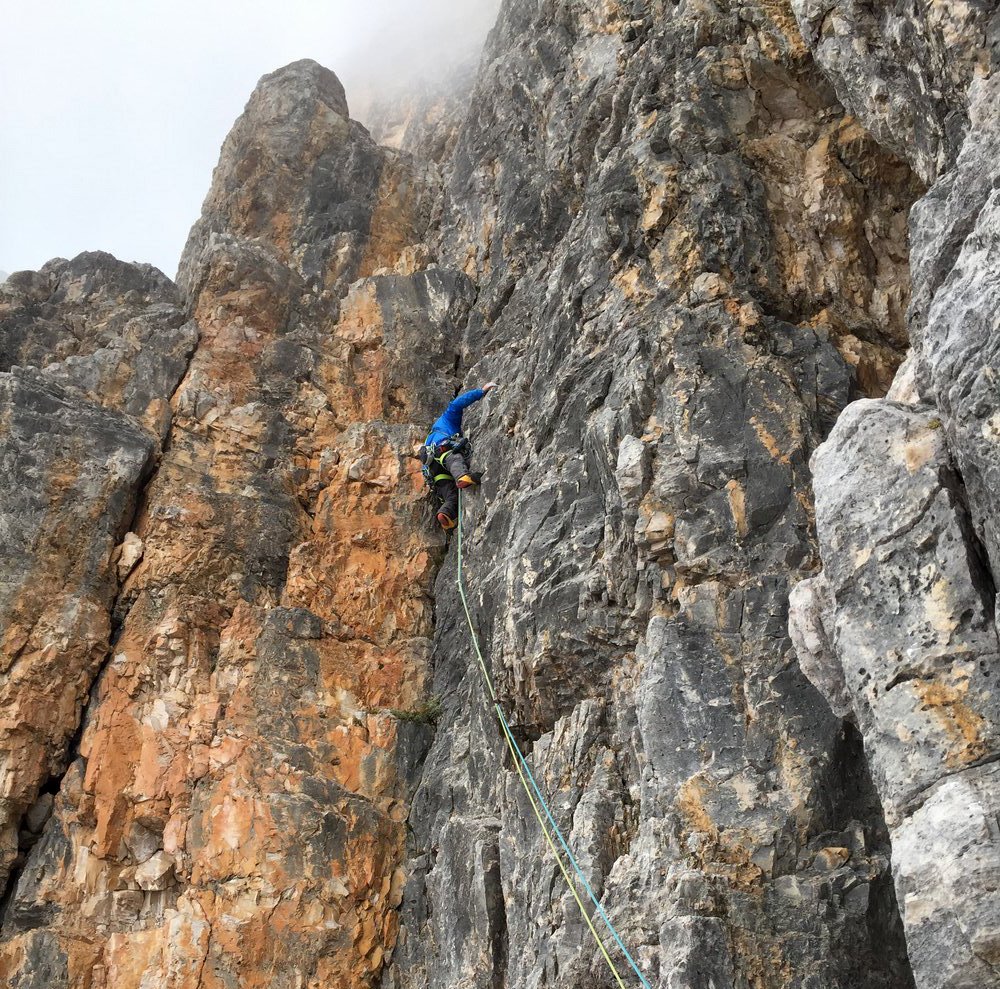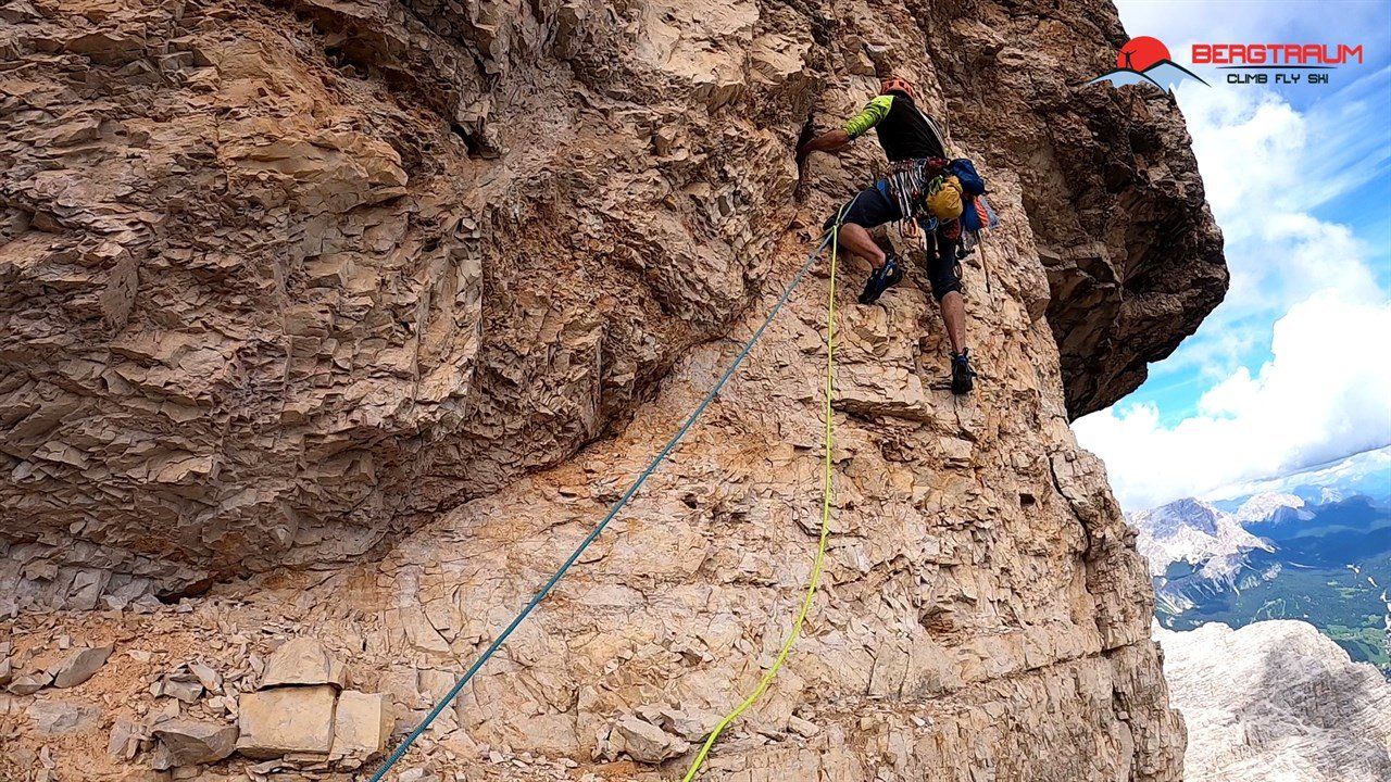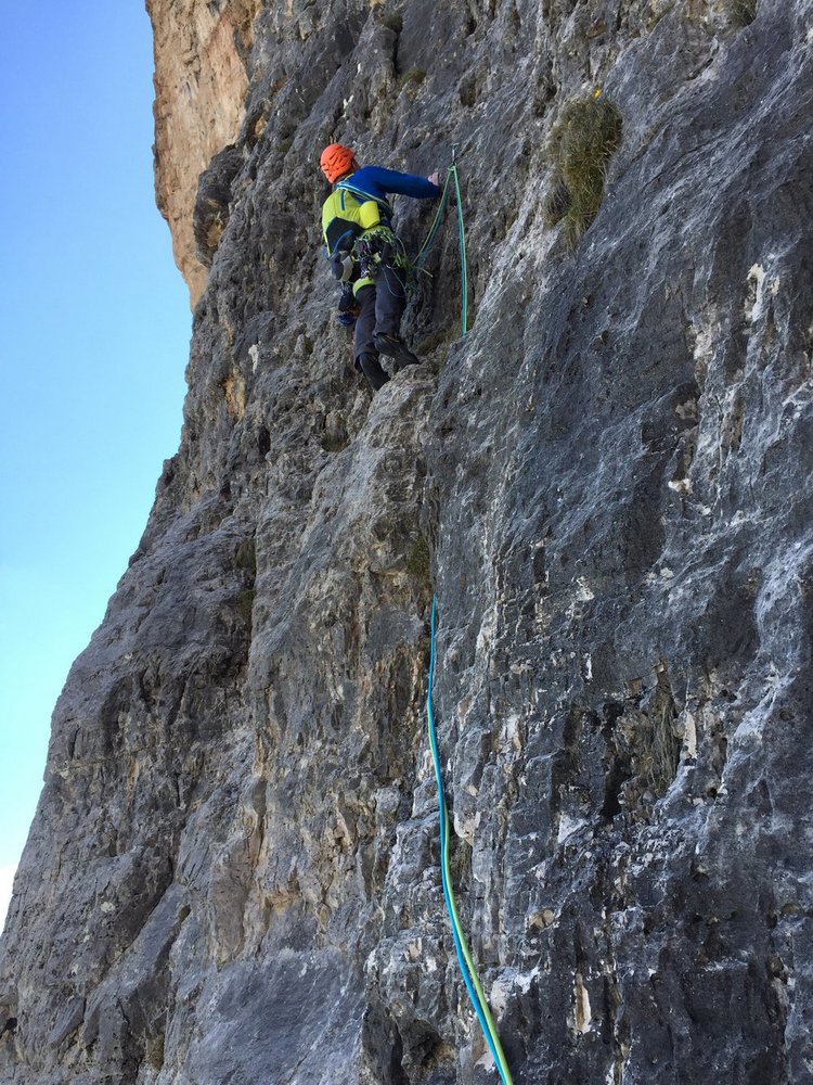 Die Ode an die Freunde verläuft über den 4. Pfeiler der Südwand der Tofana di Rozes. Die erste Seilelänge startet knackig mit einer 8-Stelle.