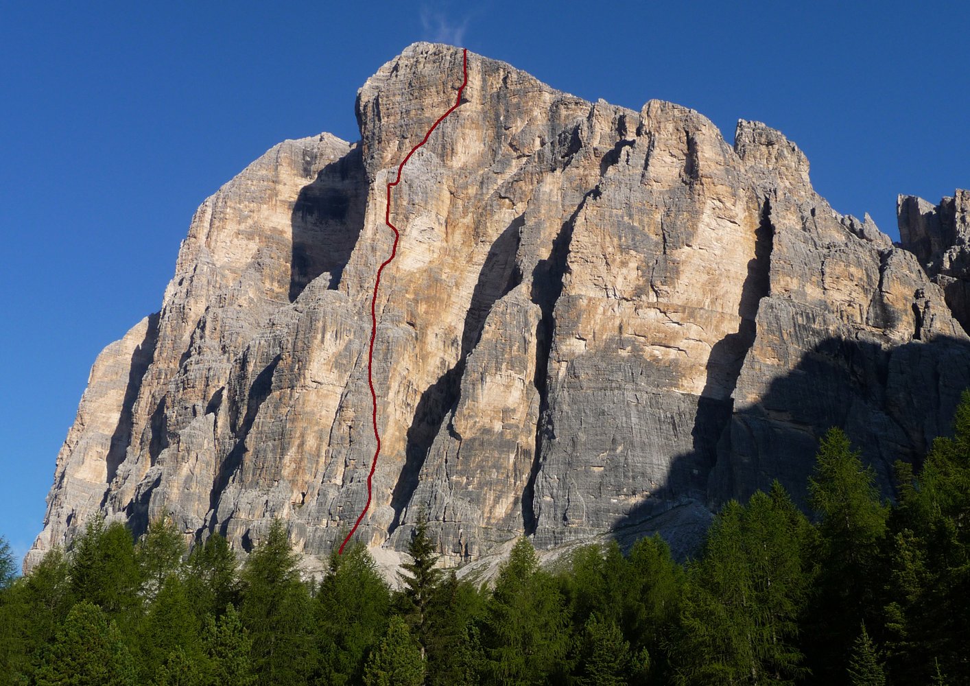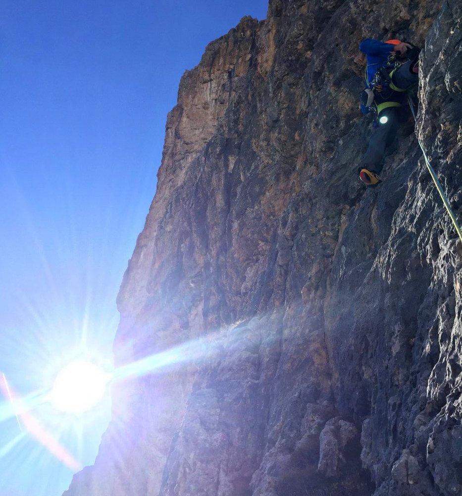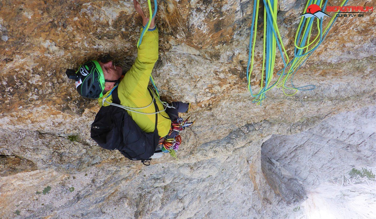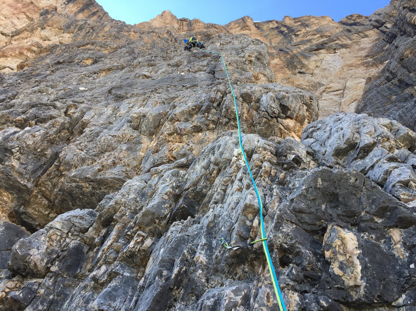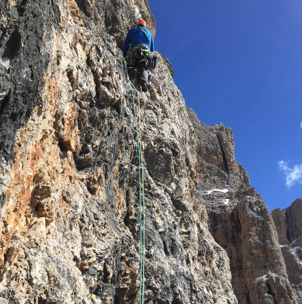 Die Ode an die Freunde verläuft über den 4. Pfeiler der Südwand der Tofana di Rozes. Die erste Seilelänge startet knackig mit einer 8-Stelle.