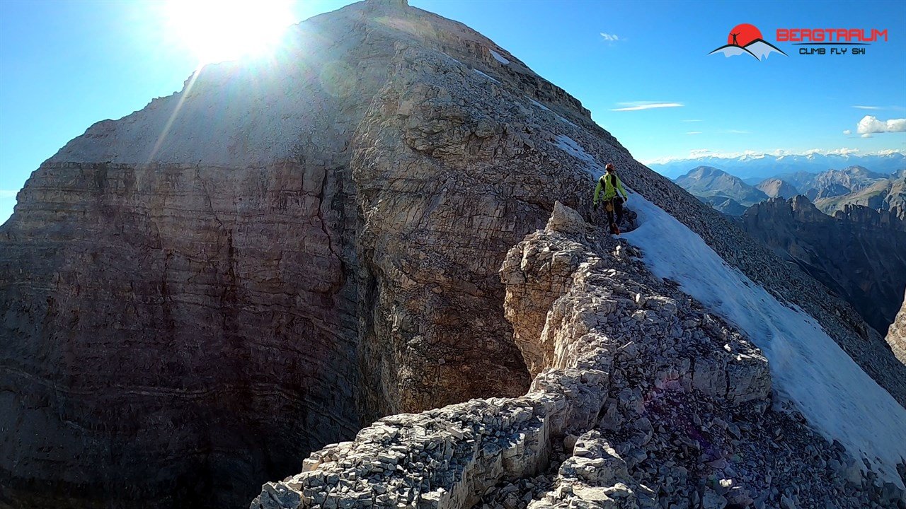 Vom Ausstieg 3020m weiter über den Ostgrat zum Gipfel 3225m, ca. 40 Minuten. Über den Normalweg, blaue Punkte und Steinmänner in ca. 1,5 Std. zur Rifugio Giussani, 2580m, und von dort noch eine gute Stunde zur Rifugio Dibona, Parkplatz.