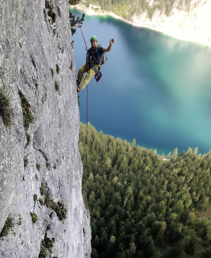 Auf Steigspuren, in rund 10 Min. gerade hinauf zur Scharwandalm (unbew.) und zum „Steiglpassweg“ - markierter Wanderweg. In ca. 45 Min. zum GH Gosausee. Abseilen über die Abseilpiste mit 50 m Doppelseil möglich, siehe Topo!