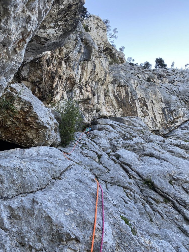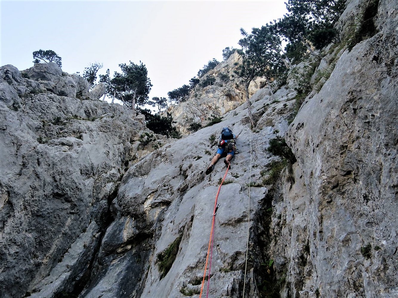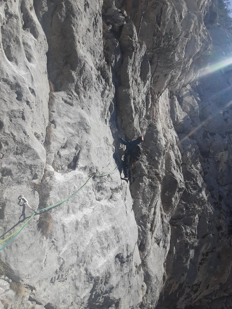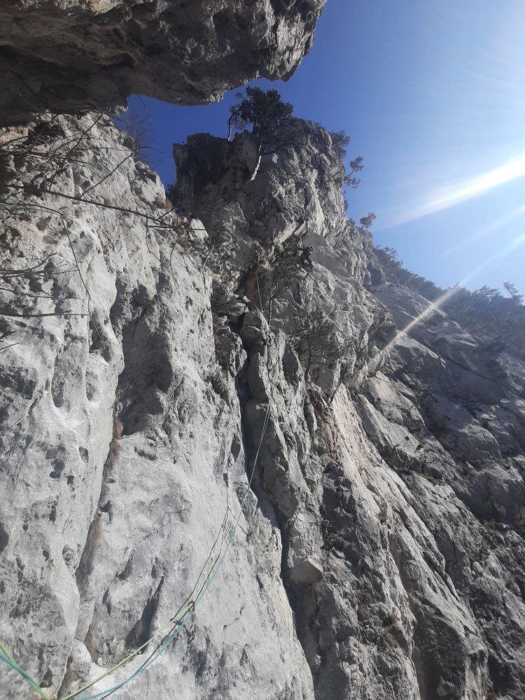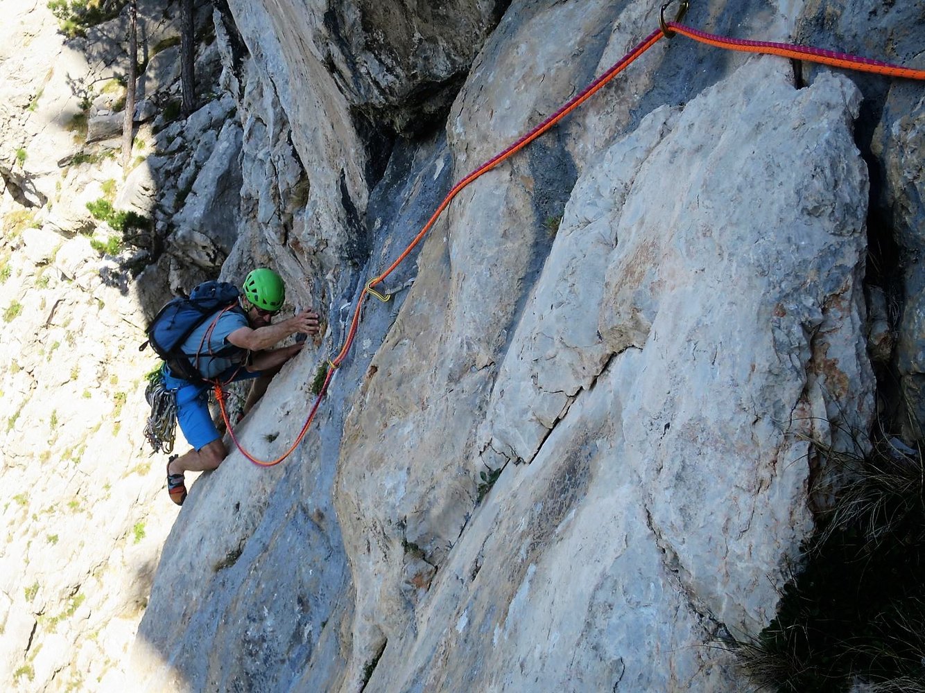 Unten kam auch eine leichte Seillänge dazu, da der ursprüngliche Zustieg über rechts sehr steinschlaggefährdet ist.