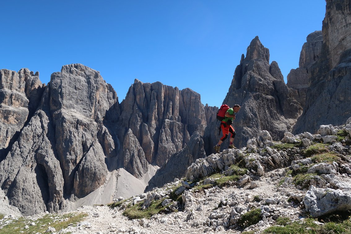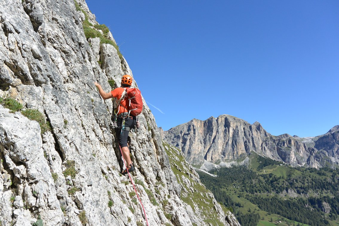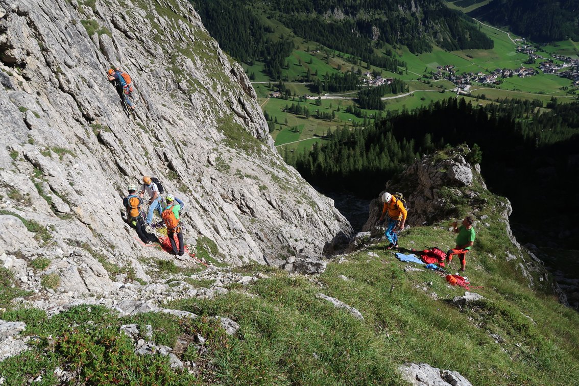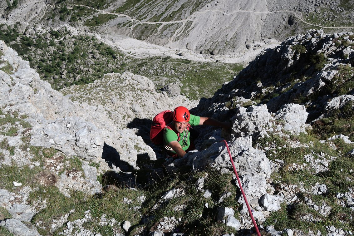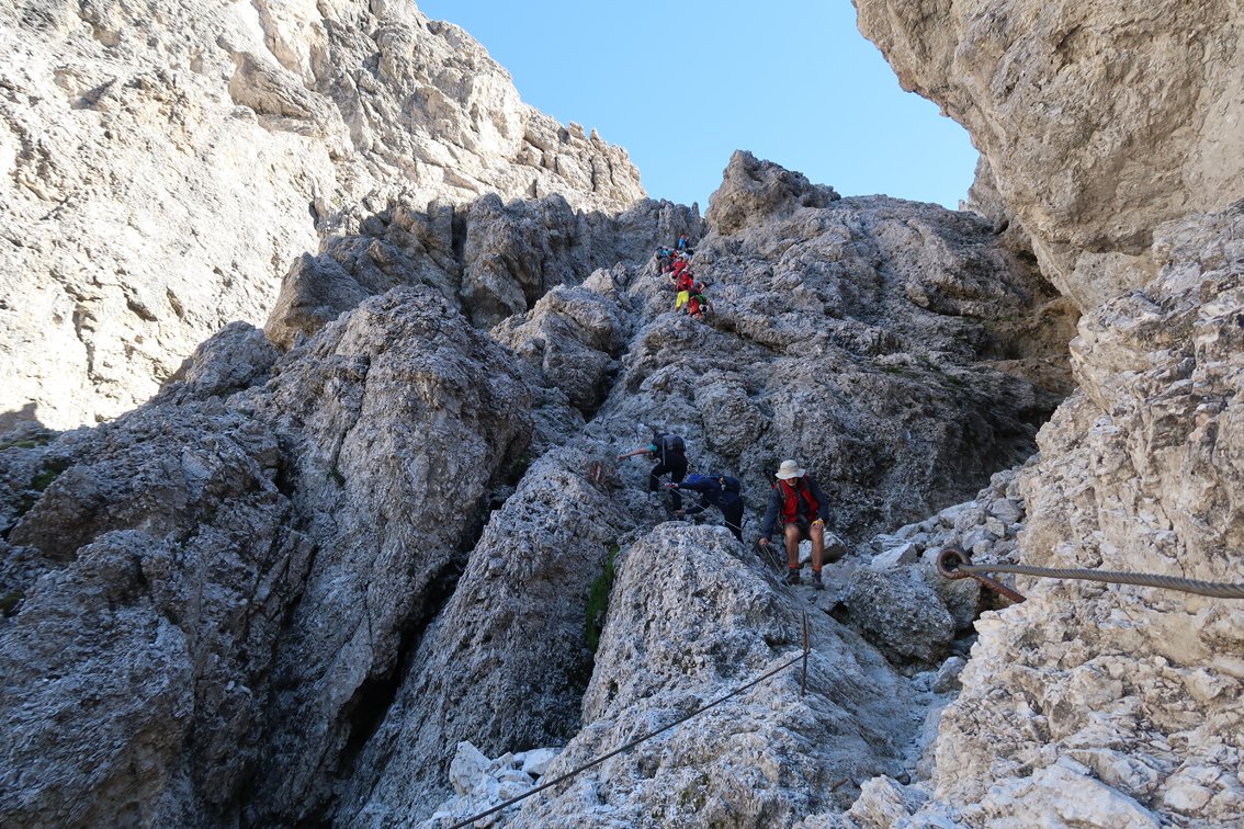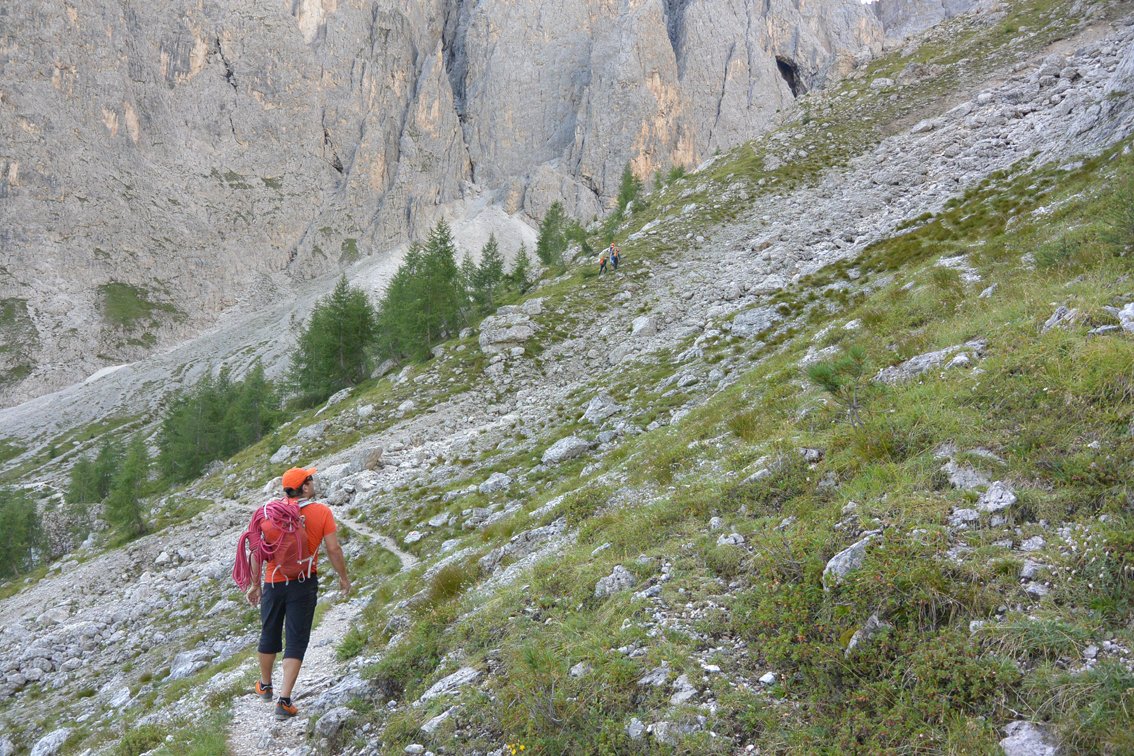 Am Ende der Tour zunächst auf Wiesen etwas aufwärts bis zum Wanderweg. Auf diesem entweder zur Pisciadu Hütte und anschließend durch das Val Setus (tlw. versichert) zurück zum Parkplatz absteigen oder man steigt den Wanderweg links ins Mittagstal ab (auch kurz versichert) und dann auf dem Zustiegsweg zurück zum Parkplatz. Beide Möglichkeiten sind ungefähr gleich lang.