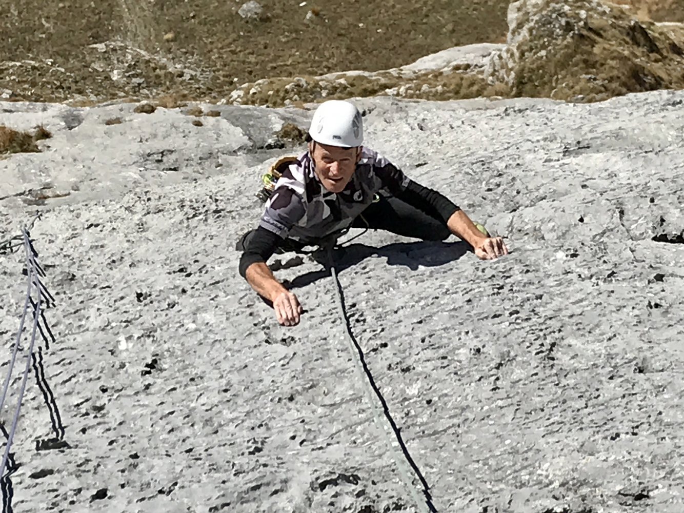 6 SL: 40 m zuerst über sehr schöne Platten VI+ und danach in etwas alpinem Gelände im fünften Grad zum Stand.