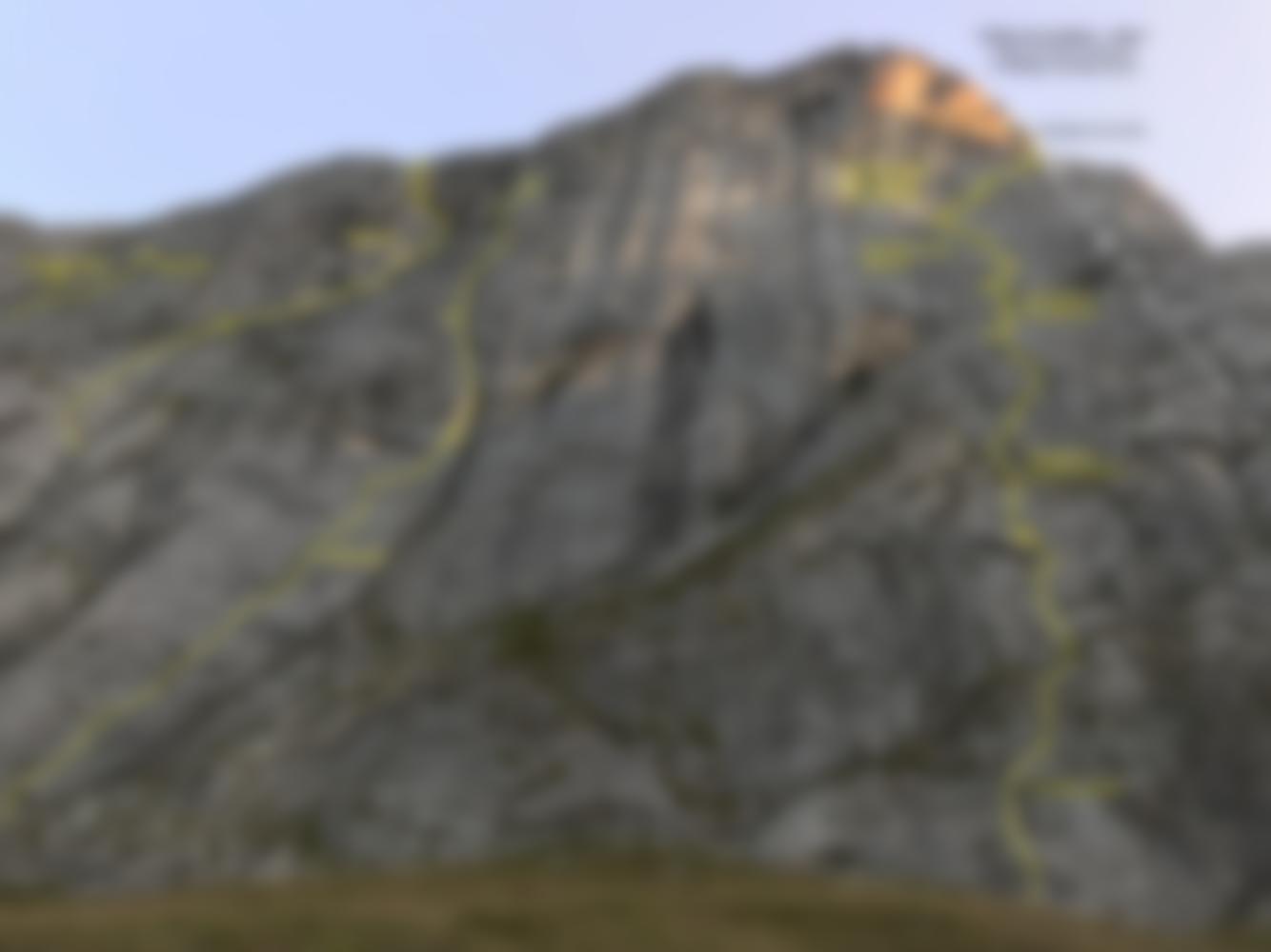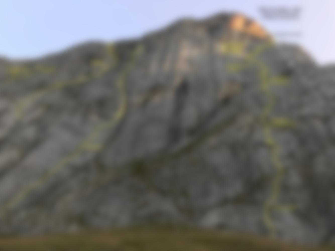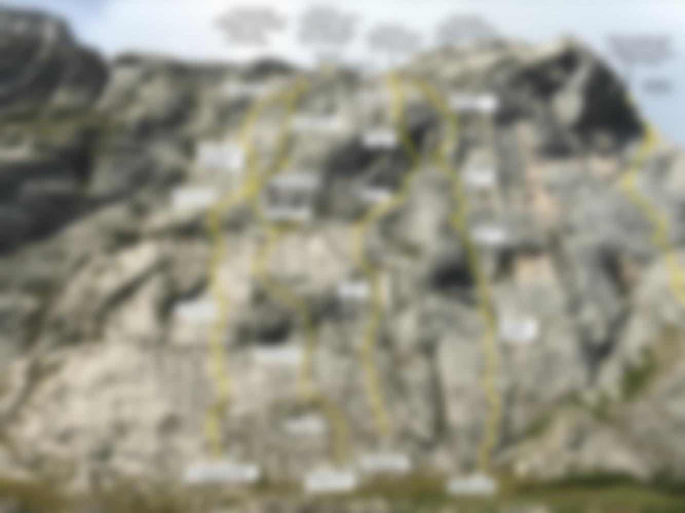 Kurze alpine Sportklettertour mit Stellen bis in den achten Grad. Obligatorisch VII+. Abseilpiste vorhanden - siehe Skizze. Weitere Tourenmöglichkeiten gleich links daneben - ca. 50 m. (Einfach Geil / Sylvi-Line etc.)