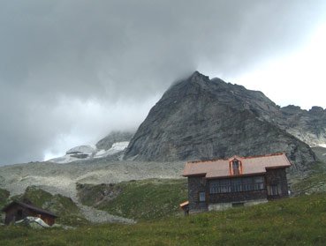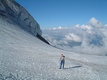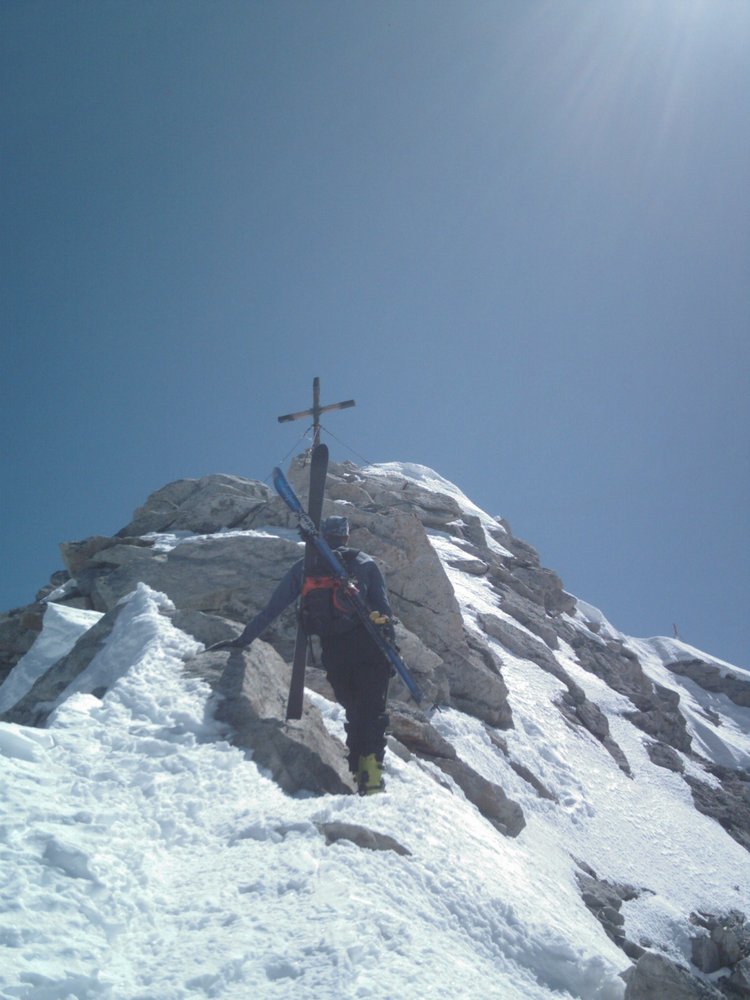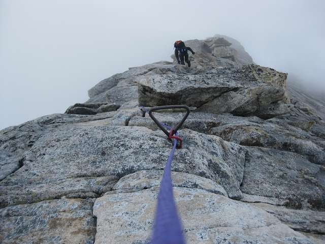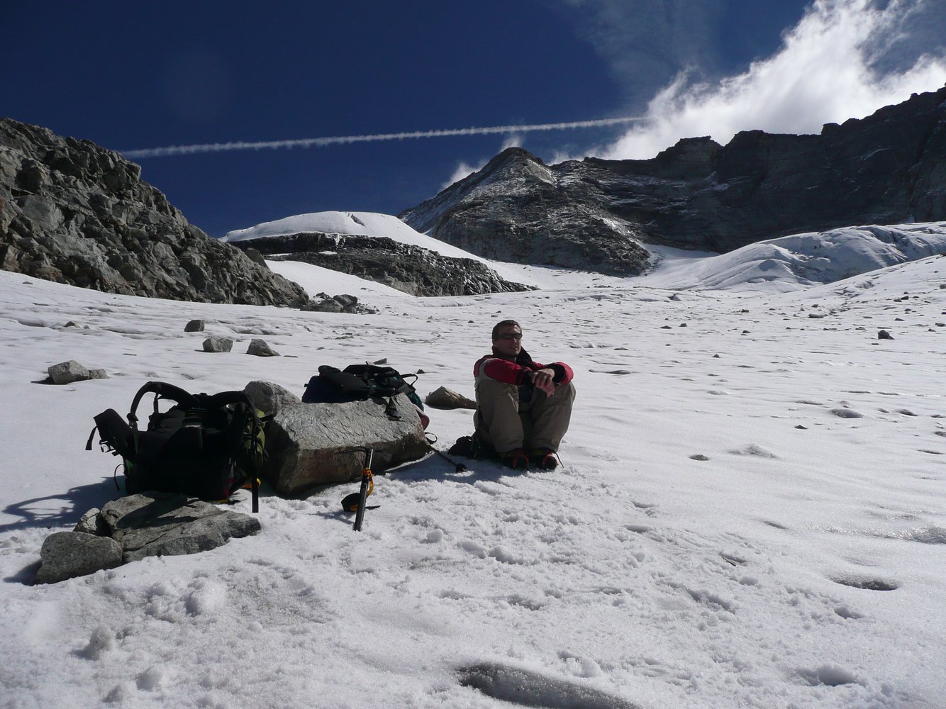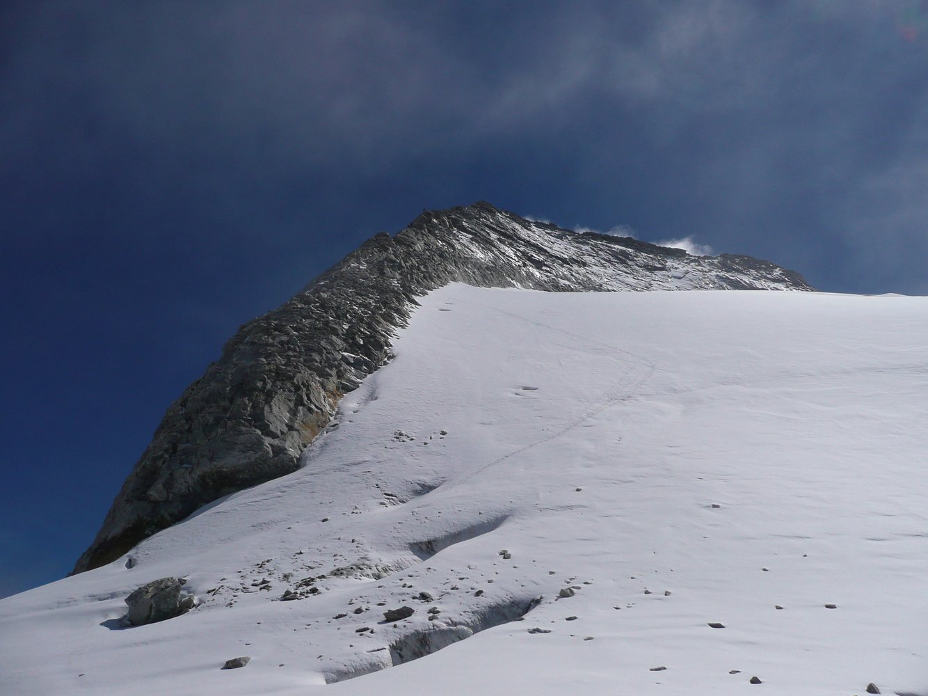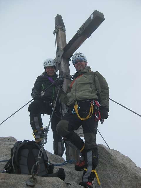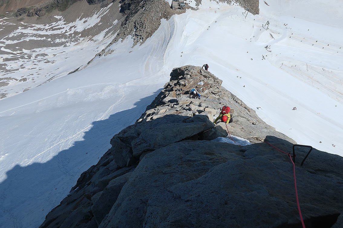Einfachseil und ein paar Expressschlingen oder Karabiner (größere Karabiner zum Einhängen iin die Entenschnäbel von Vorteil). Für den Zustieg ist komplette Gletscherausrüstung nötig, auch kann der Grat vereist sein - dann ist der Aufstieg eine sehr ernste Angelegenheit!