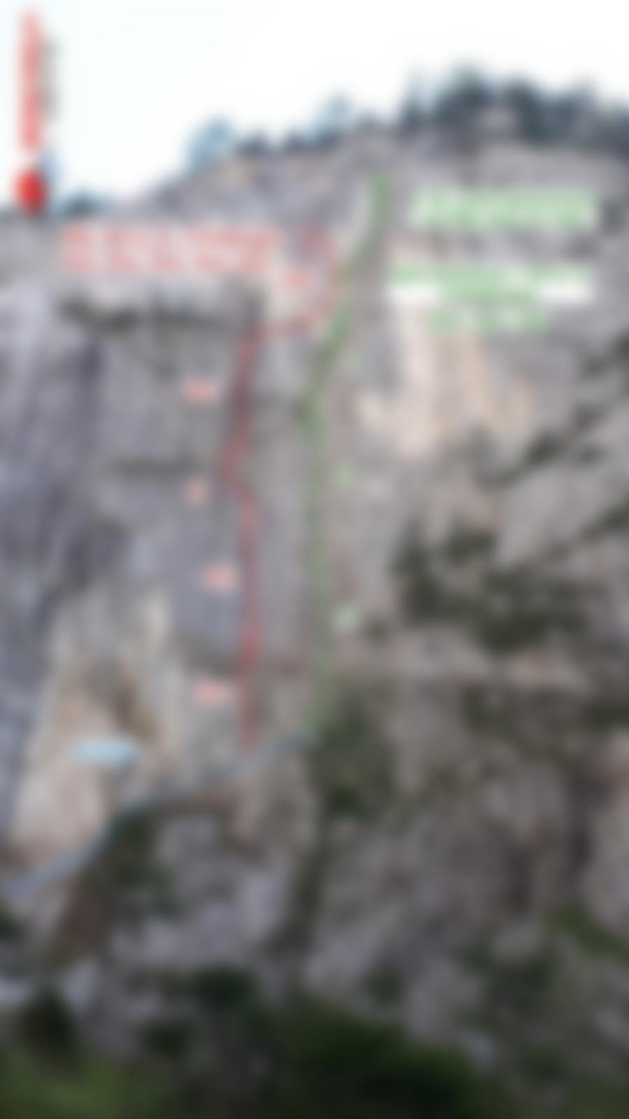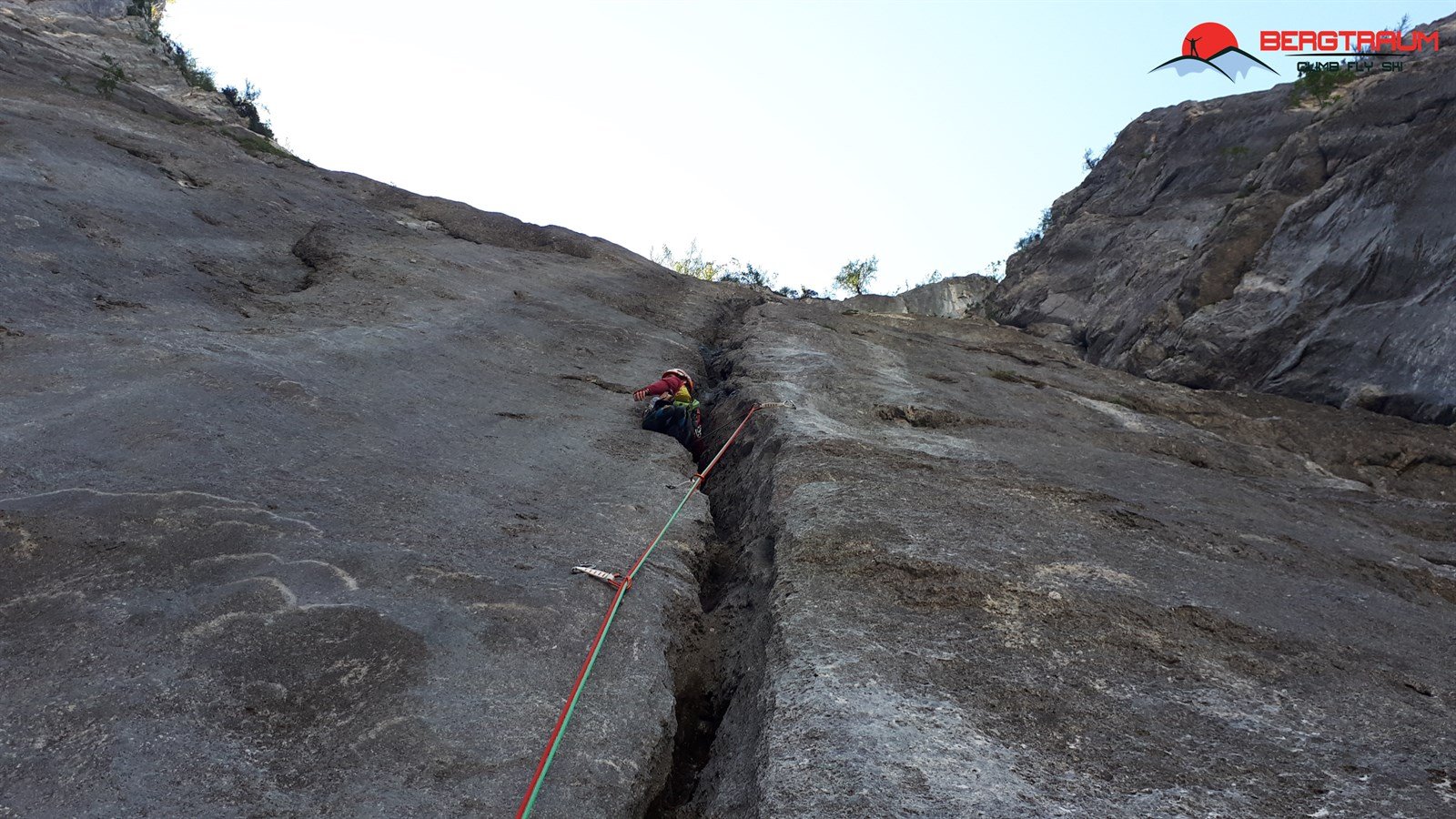 Gesamt 5 Seillängen: 8-, 7+, 6, 8-, 8+; 160 Klettermeter, Wandhöhe 150 Meter
