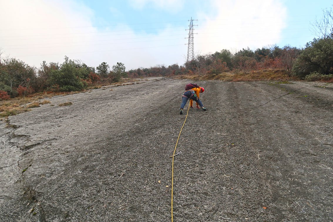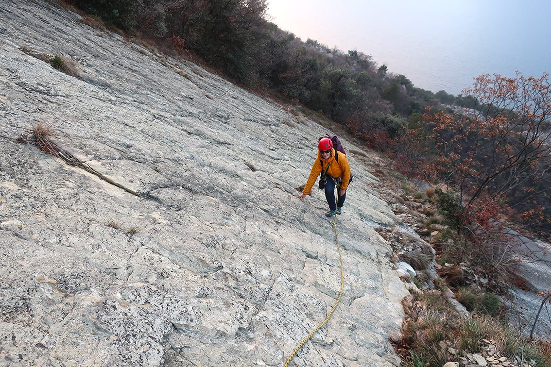 Der Vorsteiger sollten den Schwierigkeitsgrad beherrschen - ein Sturz auf den rauen, flachen Platten ist nicht zu empfehlen.