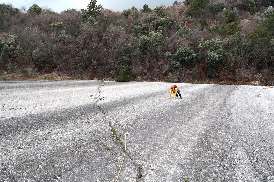Man muss oft etwas genauer schauen, um die Bohrhaken auf den Platten zu sehen. Bei Nässe nicht zu empfehlen.