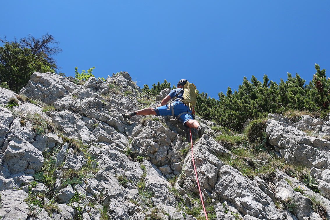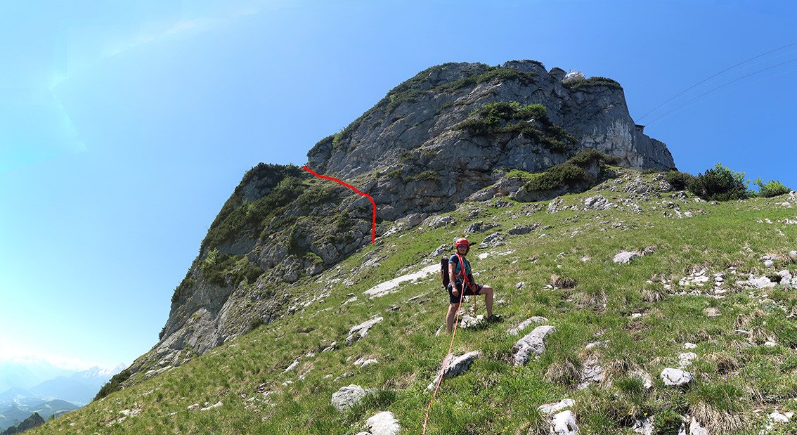 9. Seillänge (Wandbuch; ca. 180 m, gehen): Hinauf zum Wandbuch auf dem Grat, dort dann leicht links haltend im steilen Gras höher (tlw. Bohrhaken). Unterhalb der sperrenden Felsen nach links zu Bügel.