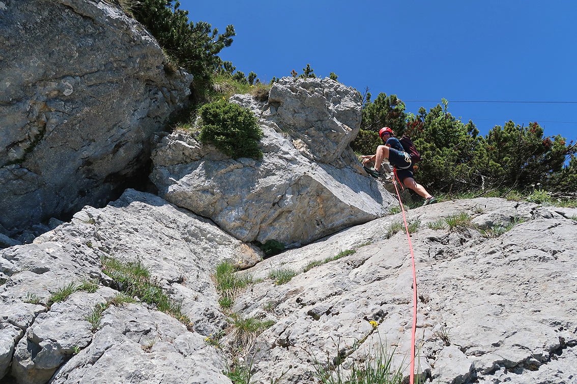15. Seillänge (2-, ca. 70 m): Leicht rechts haltend zu Bohrhaken, dann im Latschengelände (Bohrhaken) leicht höher. Auf einem freien Fleck Stand an Bohrhaken.