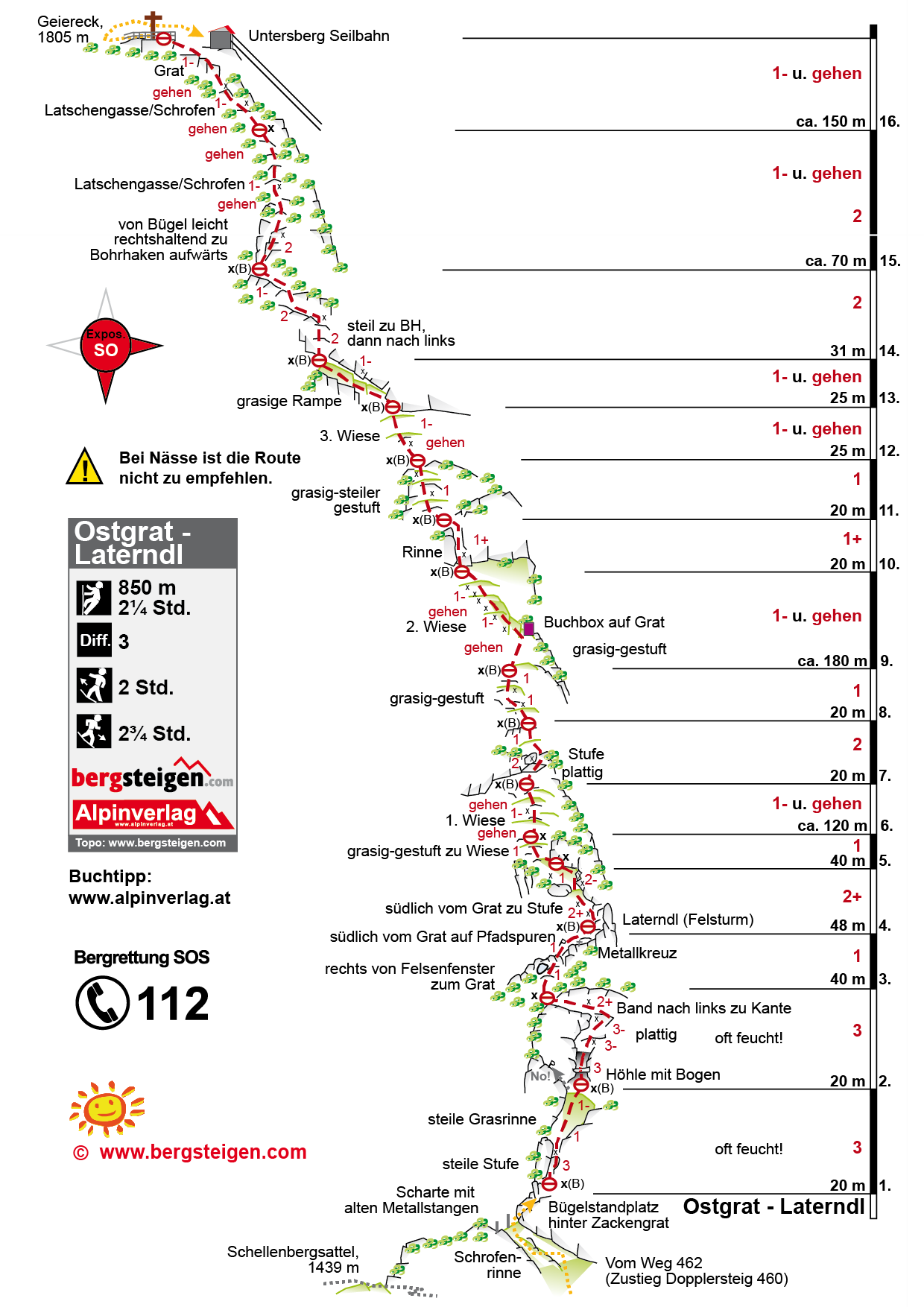 Vom Dopplersteig rechts vom Schellenbergsattel in eine Scharte (am Ende kurz 1-). In der Scharte sind alte Metallstangen (dorthin kommt man auch von der Toni-Lenz-Hütte kommend, man steigt vor dem Schellenbergsattel über sehr steiles Gras zur Scharte). Man klettert ein paar Meter über einen Zackengrat und findet dahinter einen Bügel (Einstieg Ostgrat Laterndl).