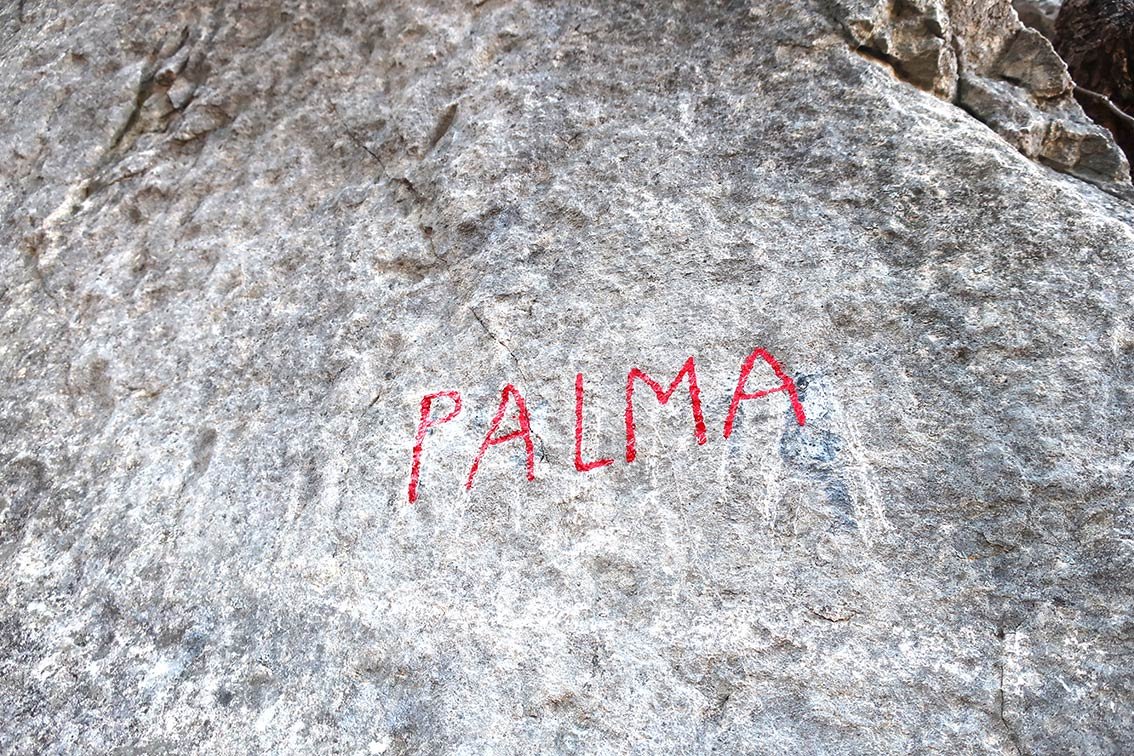 Vom Parkplatz zur römischen Brücke und von dieser links in Richtung Monte Colt. Gleich nach den Oliven-Terrassen nicht rechts weiter, sondern gerade auf dem Forstweg in den Wald. Nach wenigen Minuten zweigt rechts ein Pfad ab, dem man aufwärts bis zum Klettergarten folgt. Rechts unterhalb vom Klettergarten ist der Einstieg (rot angeschrieben - Palma). Zur besseren Orientierung siehe auch Übersichtsbild.