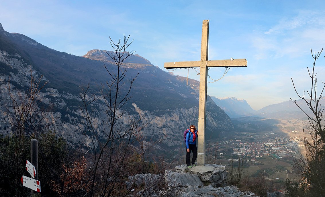 Vom Ende der Route folgt man der roten Punktmarkierung bzw. tlw. auch weglos bis zum Gipfelkreuz. Dort auf dem markierten Weg zurück nach Ceniga, bei der römischen Brücke dann rechts zum Parkplatz.