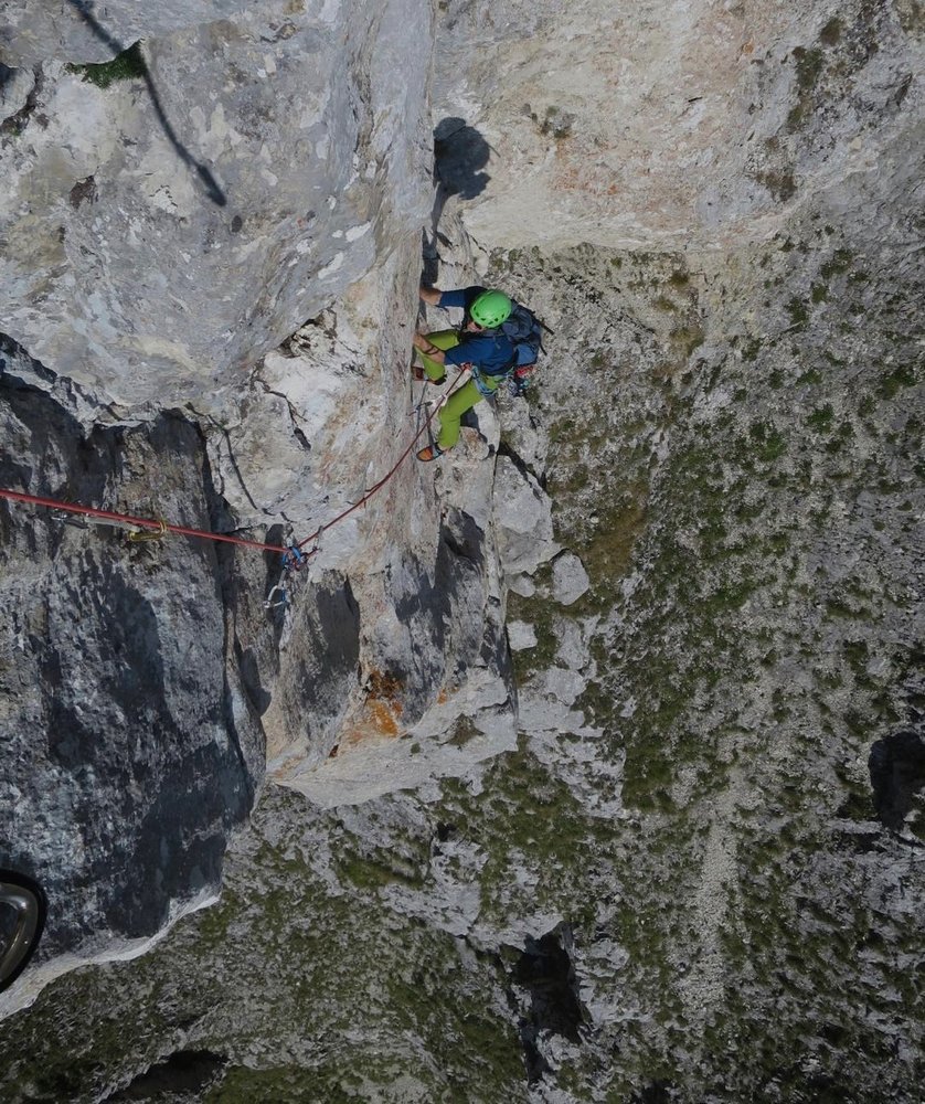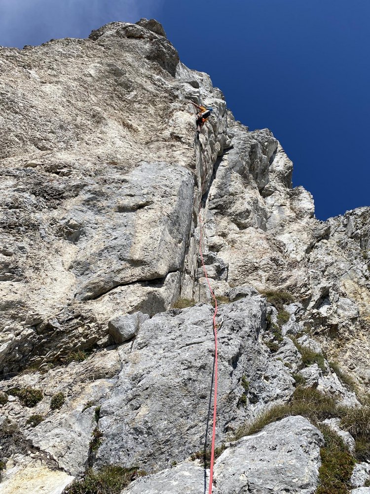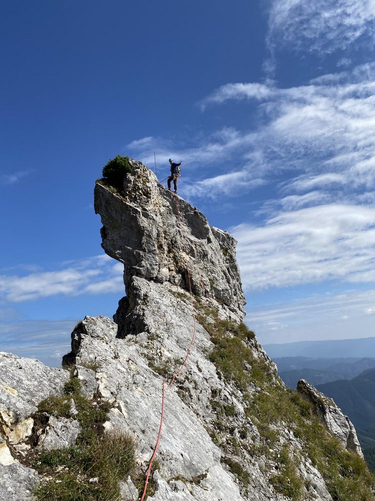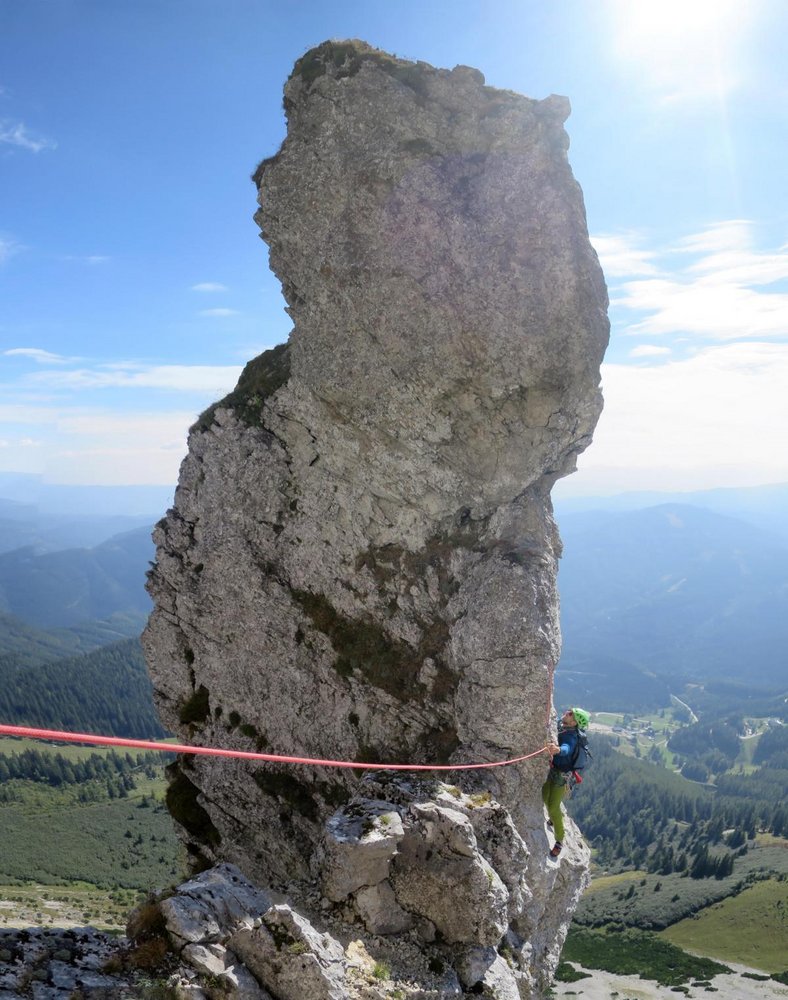 Alpin und eindrucksvoll, top gesichert und dennoch leicht würzig und abenteuerlich. Mit diesen Attributen wird versucht die Kletterei neutral zu beschreiben. Die hoch über dem, bei Wanderern überaus beliebten „Panoramaweg“ verlaufende Route ist abwechslungsreich und trotz der sehr guten Absicherung fordernd. Wer es bis zum Ausstieg auf der wunderschönen Blumenwiese am Plateaurand schafft, hat nicht nur über 300 Klettermeter und mehr als 10 gefinkelte Seillängen, sowie eine kurze Abseilfahrt hinter sich, sondern darüber hinaus mit Sicherheit auch spannende Momente in einer bislang völlig unbekannten und unberührten Wandflucht erlebt. Es hat seinen Grund, warum bislang nichts über lange Routen hoch über der Brunnalm, auf der Südseite der Hohen Veitsch, bekannt war! Eine durchgängige frei kletterbare Linie in einigermaßen akzeptablem Felsen zu finden, und das noch dazu gepaart mit möglichst homogenen Schwierigkeiten glich einer Quadratur des Kreises.