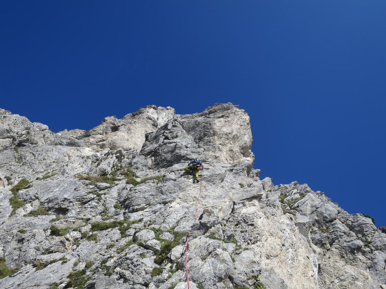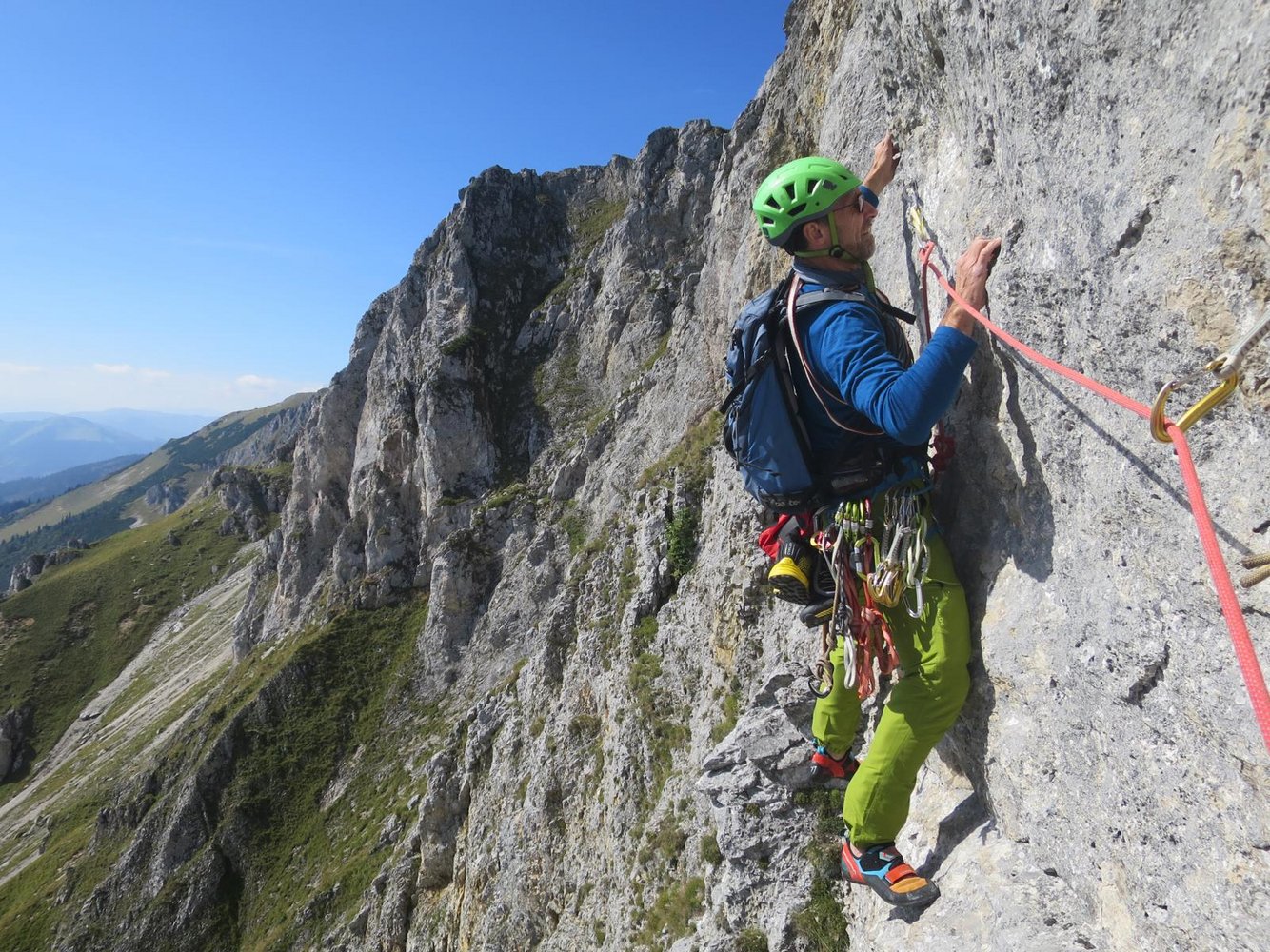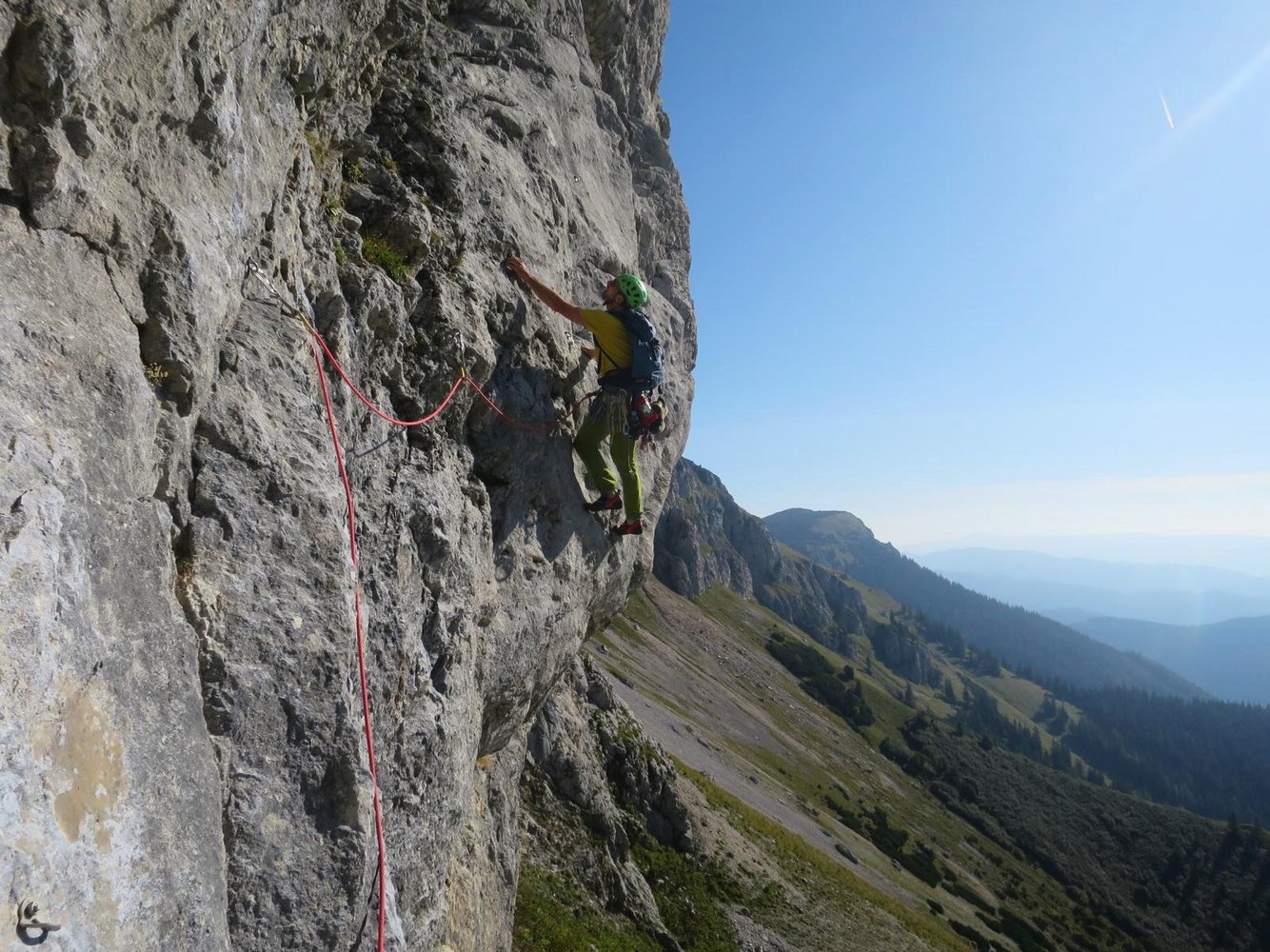 Alpin und eindrucksvoll, top gesichert und dennoch leicht würzig und abenteuerlich. Mit diesen Attributen wird versucht die Kletterei neutral zu beschreiben. Die hoch über dem, bei Wanderern überaus beliebten „Panoramaweg“ verlaufende Route ist abwechslungsreich und trotz der sehr guten Absicherung fordernd. Wer es bis zum Ausstieg auf der wunderschönen Blumenwiese am Plateaurand schafft, hat nicht nur über 300 Klettermeter und mehr als 10 gefinkelte Seillängen, sowie eine kurze Abseilfahrt hinter sich, sondern darüber hinaus mit Sicherheit auch spannende Momente in einer bislang völlig unbekannten und unberührten Wandflucht erlebt. Es hat seinen Grund, warum bislang nichts über lange Routen hoch über der Brunnalm, auf der Südseite der Hohen Veitsch, bekannt war! Eine durchgängige frei kletterbare Linie in einigermaßen akzeptablem Felsen zu finden, und das noch dazu gepaart mit möglichst homogenen Schwierigkeiten glich einer Quadratur des Kreises.