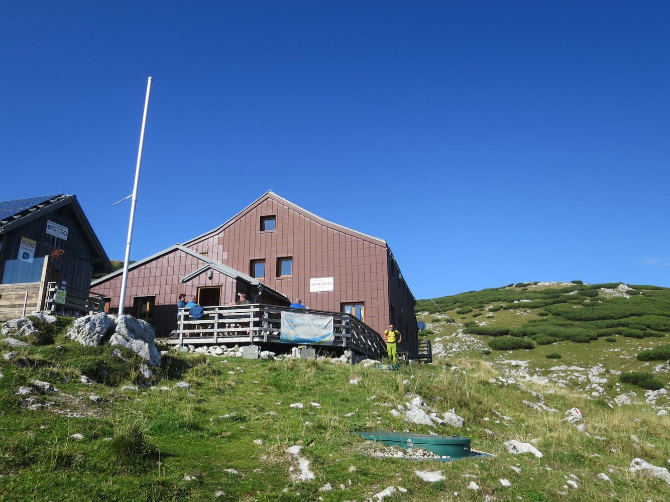 Vom Ausstieg am sichersten den Geländemöglichkeiten leicht ansteigend etwa 10 min nach Norden – in Richtung Vorkogel- folgen bis man auf den querenden markierten Wanderweg triff. Alternativ entlang der Felsabbrüche weglos nach Westen bis zum Wanderweg. Diesem folgt man anschließend nach links (westlich) bis man nach weiteren etwa 20min das Graf Meranhaus (1.836m) erreicht. Von dort in rund einer Stunde zurück hinunter zur Brunnalm.