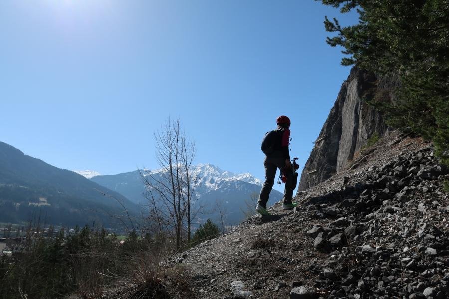 Vom Ausstieg nach rechts zum Wanderweg (E5) und auf diesem hinunter zum Schotterweg auf der Autobahngalerie. Von dort wie beim Zustieg zurück zum Auto.