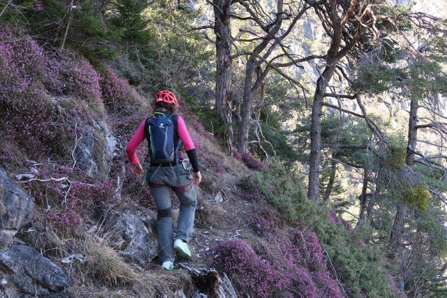 Zuerst über die Autobahngalerie auf die Schotterstraße, auf dieser rechts und später auf Pfadspuren hinauf zur Wand.. Am Ende kurz steiler zu den Einstiegen bei einem kleinen Wäldchen im rechten Wandteil.