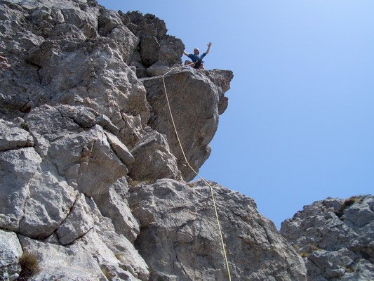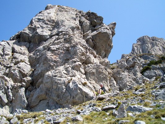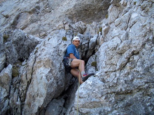 3. Durch den Kaminspalt aufwärts und so bald als möglich rechts auf einen kompakten Pfeiler (Superfels) bis zu einem ebenen Platz unter der Gipfelwand (35m; 3)