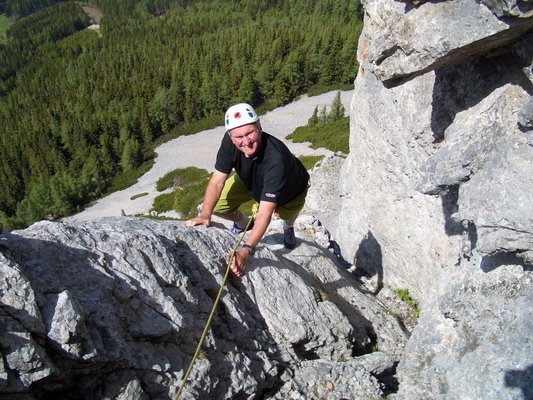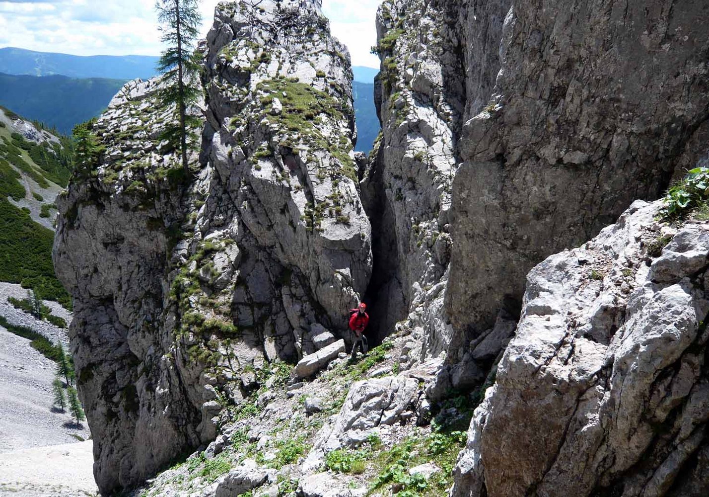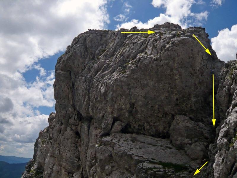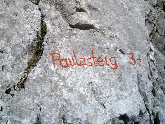 Abstieg: Jenseits den schmalen Gipfelgrat ein paar Schritte abwärts bis zu einem etwa 5m hohen Abbruch. Entweder abklettern (2) oder abseilen. In der darauffolgenden Geröllschlucht abwärts und rechts um den Bergkörper herum zurück zum Einstieg. Oder (empfehlenswert) Abstieg durch die Jahnschlucht (2), die zwischen Paulaturm und dem östlich vorgelagerten Jahnturm schmal hindurchführt zurück zum Einstieg.