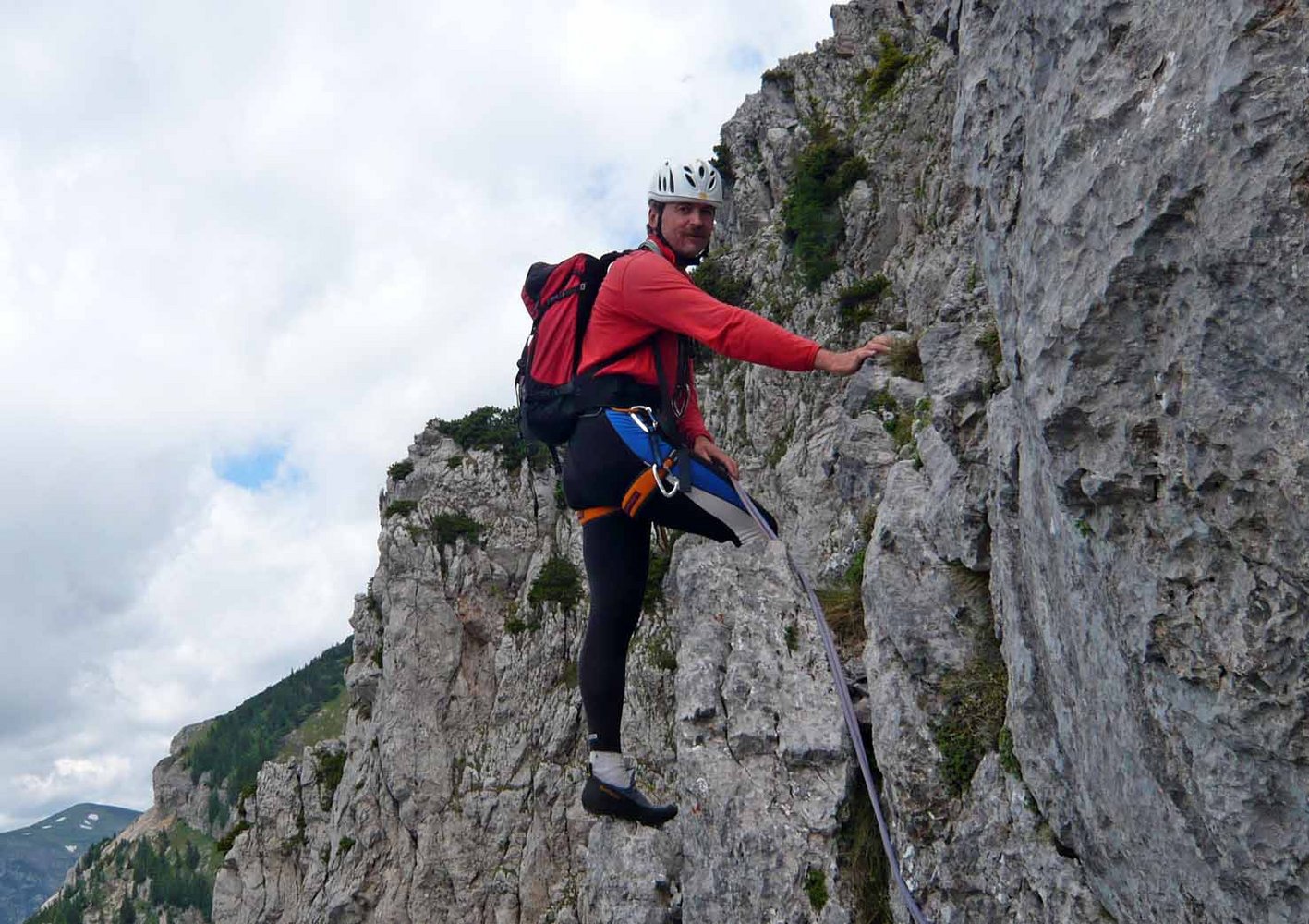 Kletterausrüstung, Helm und ev. 2 längere Bandschlingen mitnehmen