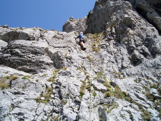 1. Vom E über eine etwas schrofige Wand aufwärts auf einen Absatz und auf breitem Band kurz nach li zu Stand (25m; 3+)